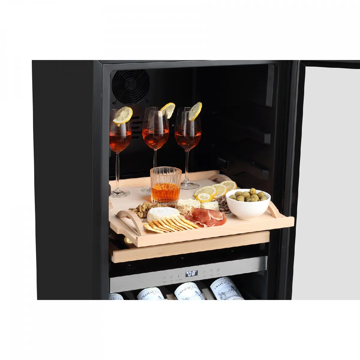 Le système multi-températures propose deux zones réglables pour séparer rouges, blancs et mousseux. La zone dédiée aux rouges couvre 12-20 °C pour un vieillissement plus régulier et équilibré de vos bouteilles. La zone pour blancs et effervescents s'ajuste de 5-12 °C afin de servir à bonne fraîcheur ou de stocker dans des conditions adaptées. Le froid ventilé répartit l'air de manière homogène pour limiter les écarts entre clayettes et favoriser une stabilité utile à la préservation des arômes.