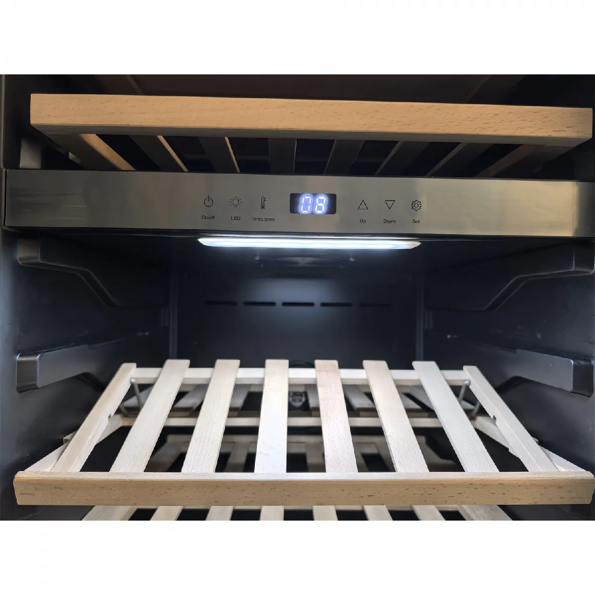 La technologie anti-vibration, associée au compresseur, protège les dépôts et favorise une maturation sereine. Le système de contrôle de l'humidité avec hygromètre contribue à préserver les bouchons, tandis que le filtre à charbon actif limite les odeurs indésirables. La porte vitrée triplex à faible émissivité avec protection anti-UV réduit l'impact de la lumière et des variations thermiques externes. Une alarme de porte signale les ouvertures prolongées. La capacité atteint 140 bouteilles de Bordeaux selon configuration, avec intérieur noir et finition extérieure Inox pour un ensemble cohérent.