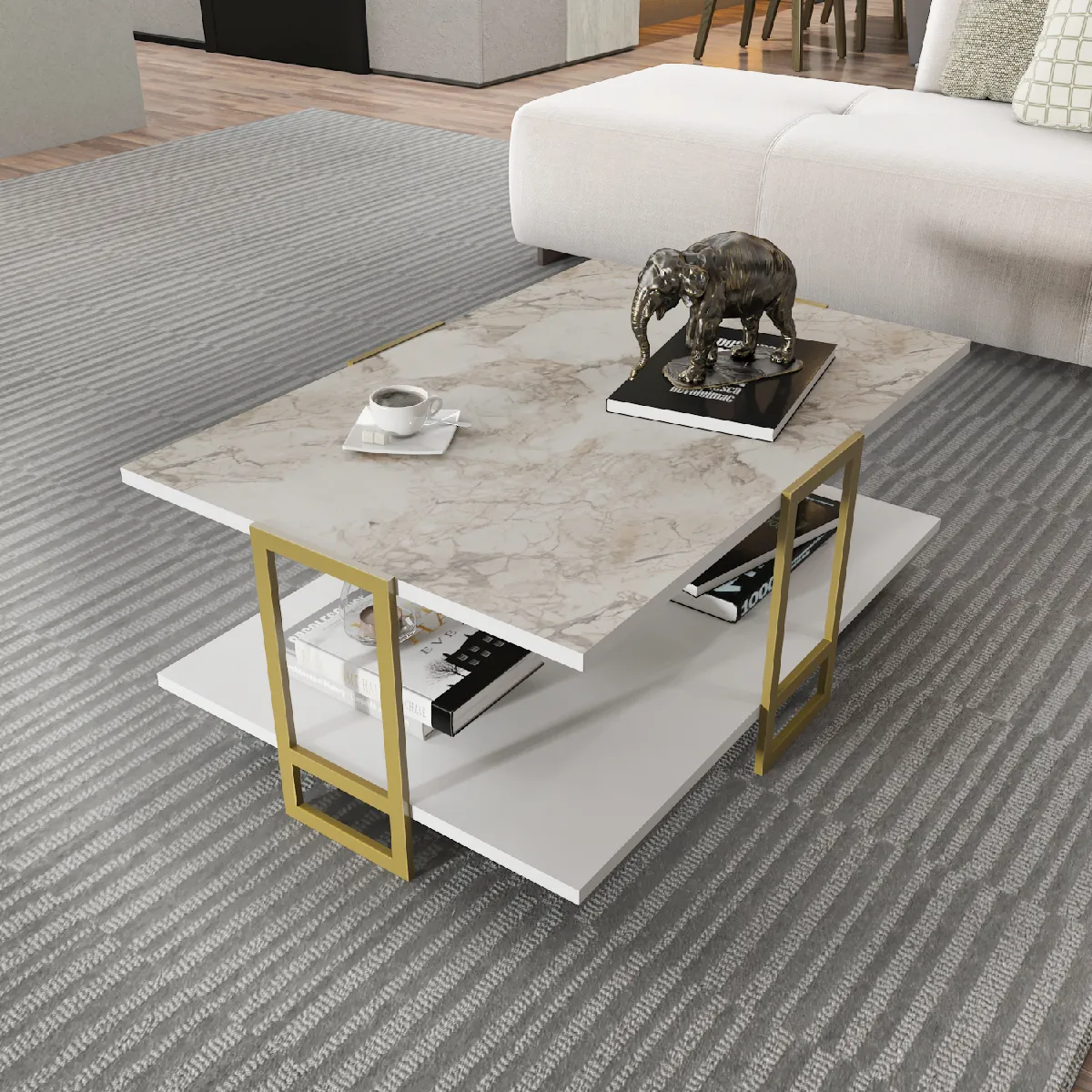 Table basse imitation marbre - Cadre métallique doré - Dimensions 36.6x91.5x61.5 cm - Montage nécessaire