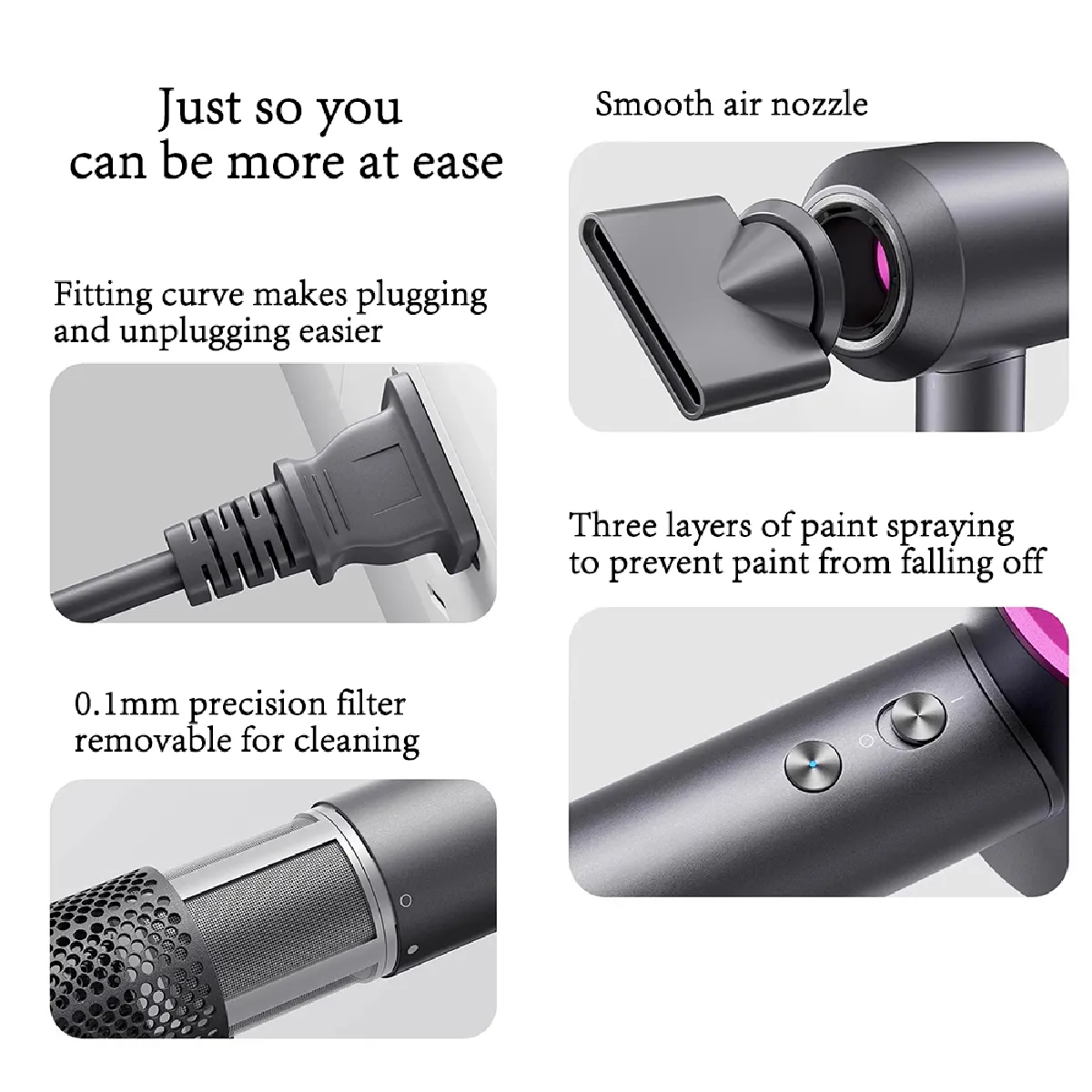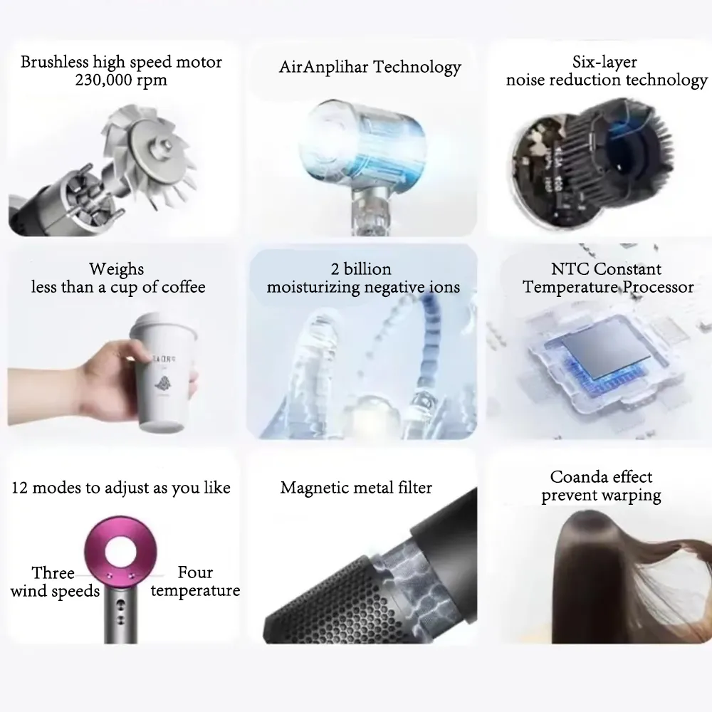 Le flux d'air puissant associé à une technologie ionique hydratante de 2 milliards d'ions négatifs accélère le séchage tout en aidant à préserver la souplesse des cheveux. Son moteur haute vitesse annoncé à 230 000 tours fournit un volume d'air important avec une stabilité remarquable. Trois vitesses et trois niveaux de température permettent d'ajuster finement le résultat selon l'épaisseur et l'état de la chevelure. Grâce à une architecture de réduction du bruit à six couches, le confort acoustique est optimisé pendant l'utilisation. La surveillance de température par processeur NTC pour un contrôle en temps réel vise à éviter les pics thermiques. L'ergonomie légère facilite la prise en main pour un séchage plus serein.