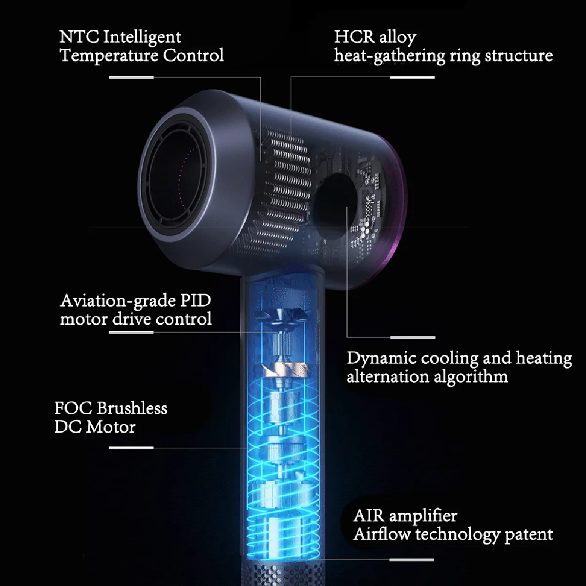 Le processeur NTC surveille la température en temps réel pour éviter des hausses soudaines et maintenir un niveau thermique plus régulier pendant le séchage.