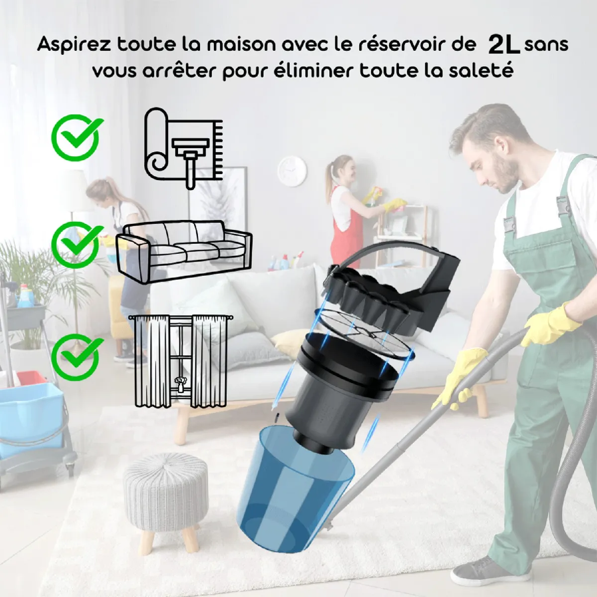 Le nettoyage quotidien gagne en régularité grâce à une aspiration efficace et une manipulation simple. Ce modèle traîneau propose une alimentation secteur stable avec variateur de puissance pour adapter l'aspiration aux surfaces. Le collecteur de 2 L limite les vidages fréquents, tandis que le format sans sac et la brosse double position facilitent le passage du sol dur aux tapis. Son poids de 4,04 kg et le tube télescopique en métal favorisent une portée confortable dans chaque pièce. Le câble de 4 m avec enrouleur intégré simplifie le rangement, et le niveau sonore de 70 dBA soutient un usage régulier à la maison. L'appareil est filaire et non connecté.