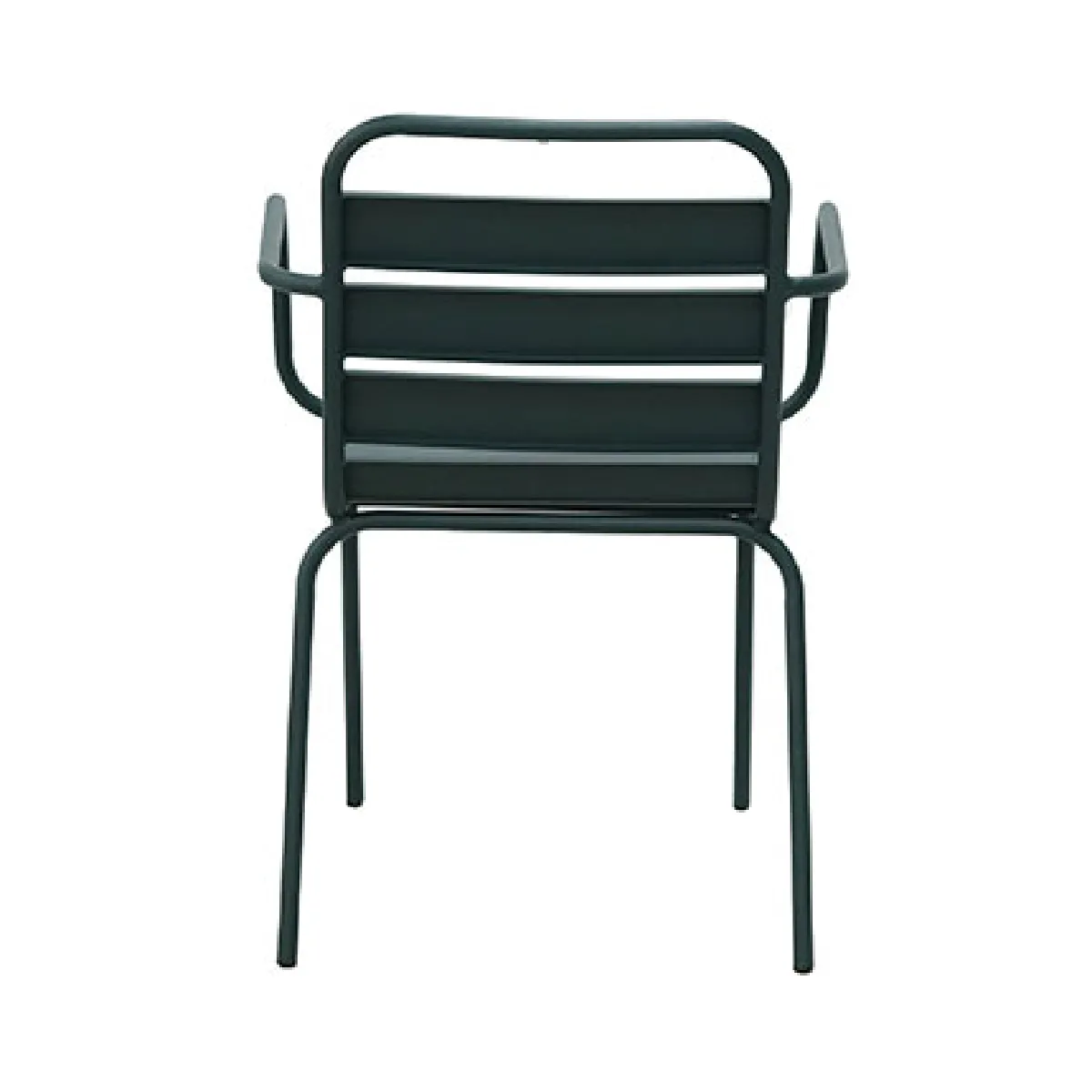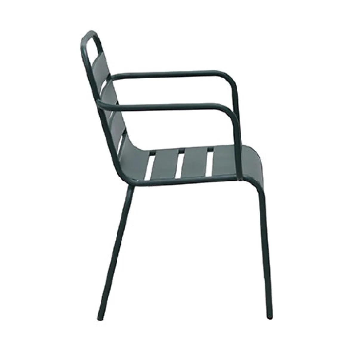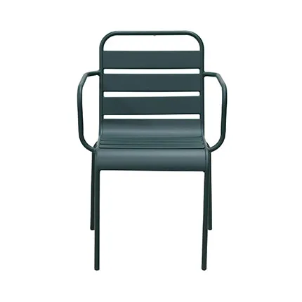 La fabrication en métal avec traitement antirouille spécialement adapté à l'usage extérieur limite l'impact de l'humidité et des variations de température. Le dossier ajouré en bandes parallèles pour une ventilation constante contribue à garder le dos au frais lors d'assises prolongées. Les accoudoirs apportent un appui supplémentaire pour se relever plus facilement, tout en stabilisant la posture à table.