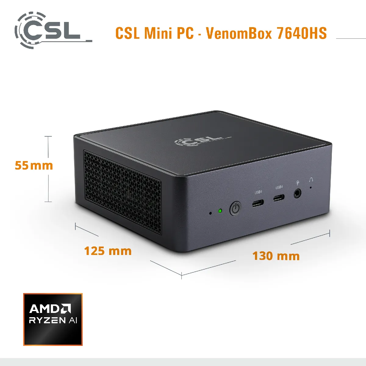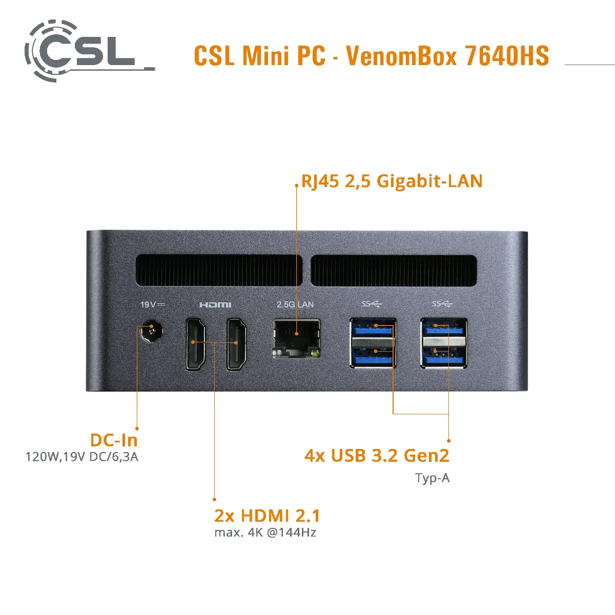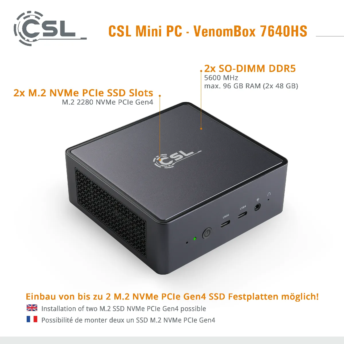 La CSL VenomBox 7640HS / 8Go / 1000 Go M.2 SSD / Windows 11 Famille convainc par un mélange parfait de performances puissantes et de petit format. Équipé du processeur efficace AMD Ryzen 5 7640HS, y compris la carte graphique Radeon 760M, ce mini-PC maîtrise sans peine vos tâches quotidiennes. Les 8 Go de RAM DDR5 assurent un multitâche fluide, tandis que le SSD M.2 PCIe de 1000 Go offre des démarrages système et des accès aux données ultra-rapides.