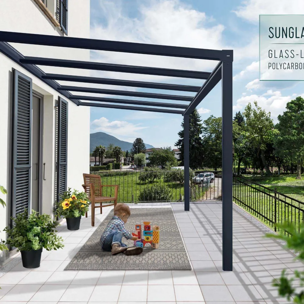 Pergola adossée en aluminium gris avec toit en polycarbonate