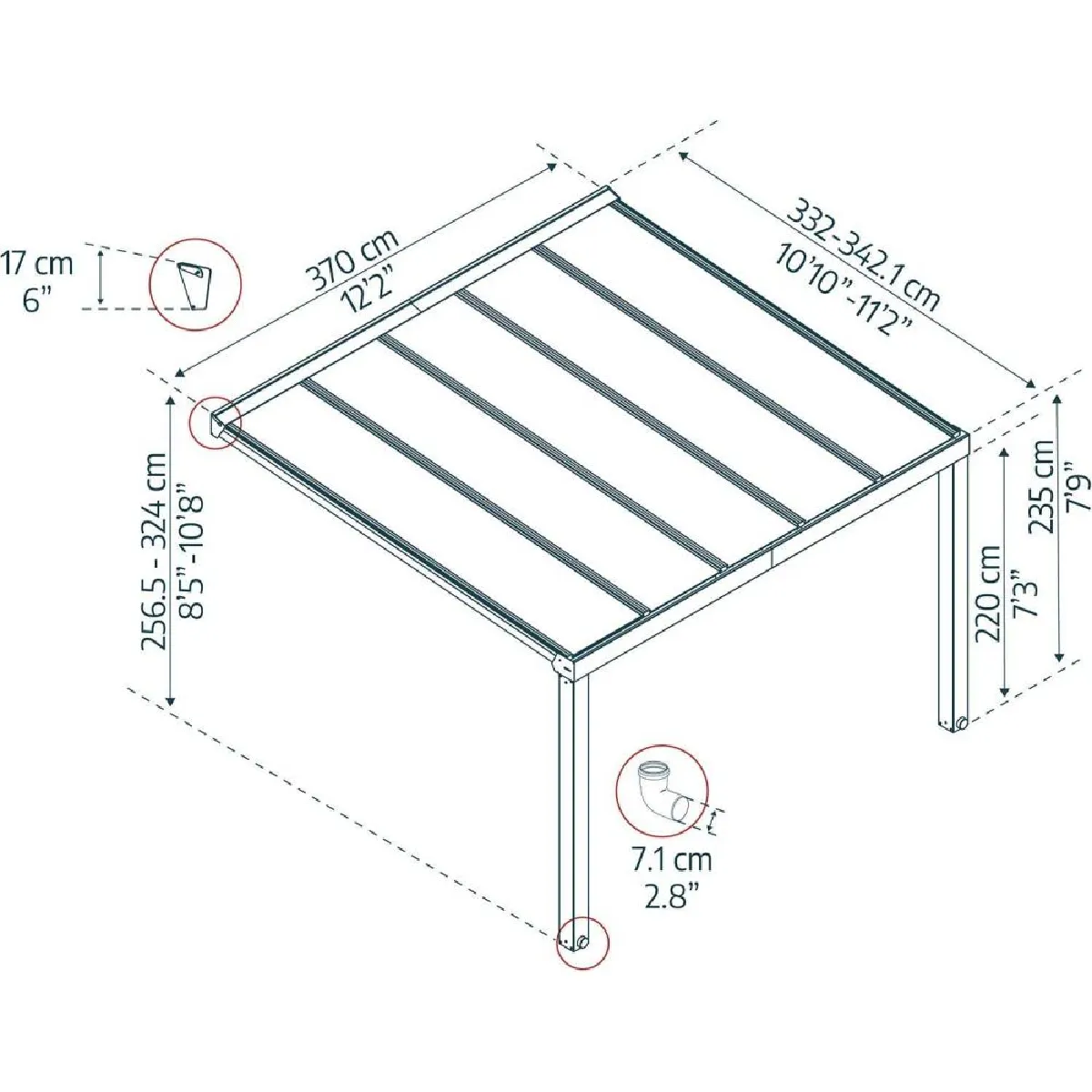 Le toit utilise une couverture en polycarbonate de 4 mm anti UV, limitant l'échauffement tout en préservant la clarté sous l'abri. La structure en aluminium inoxydable résistante contribue à la stabilité et simplifie l'entretien. Les gouttières intégrées internes et cachées collectent l'eau et la dirigent vers l'extérieur pour garder les abords propres. Les dimensions permettent d'abriter un mobilier familial : hauteur 3.24 m, largeur 3.70 m, profondeur 3.41 m, pour un poids total de 156 kg.