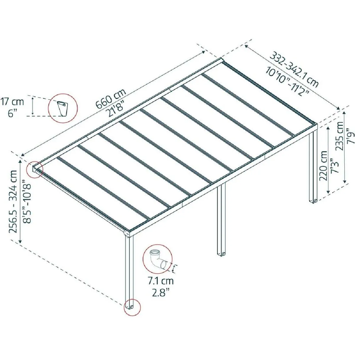 Le toit en polycarbonate de 4 mm combine filtration anti UV et résistance à la grêle et à la neige pour un usage serein toute l'année. La conception adossée et la fixation murale stable optimisent l'emprise au sol et facilitent l'intégration le long d'une terrasse. La hauteur totale de 324 cm et la hauteur de traverses de 235 cm offrent une belle circulation de l'air et un passage confortable sous la structure. Les gouttières internes et cachées guident l'eau vers l'extérieur, limitant les ruissellements sur la zone de vie.