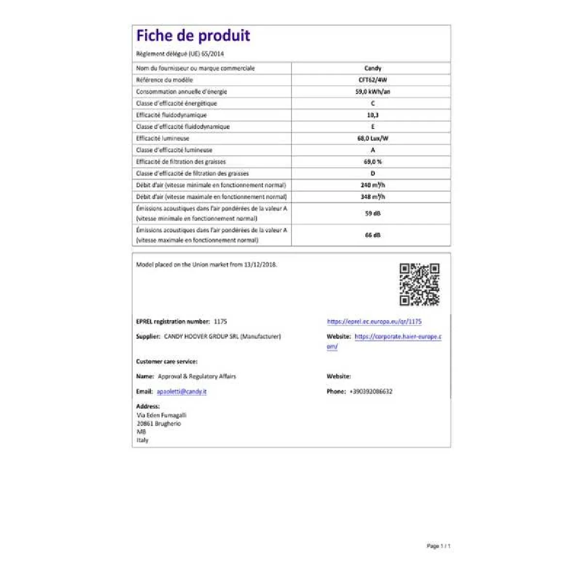 Puissance acoustique : 66 dB.