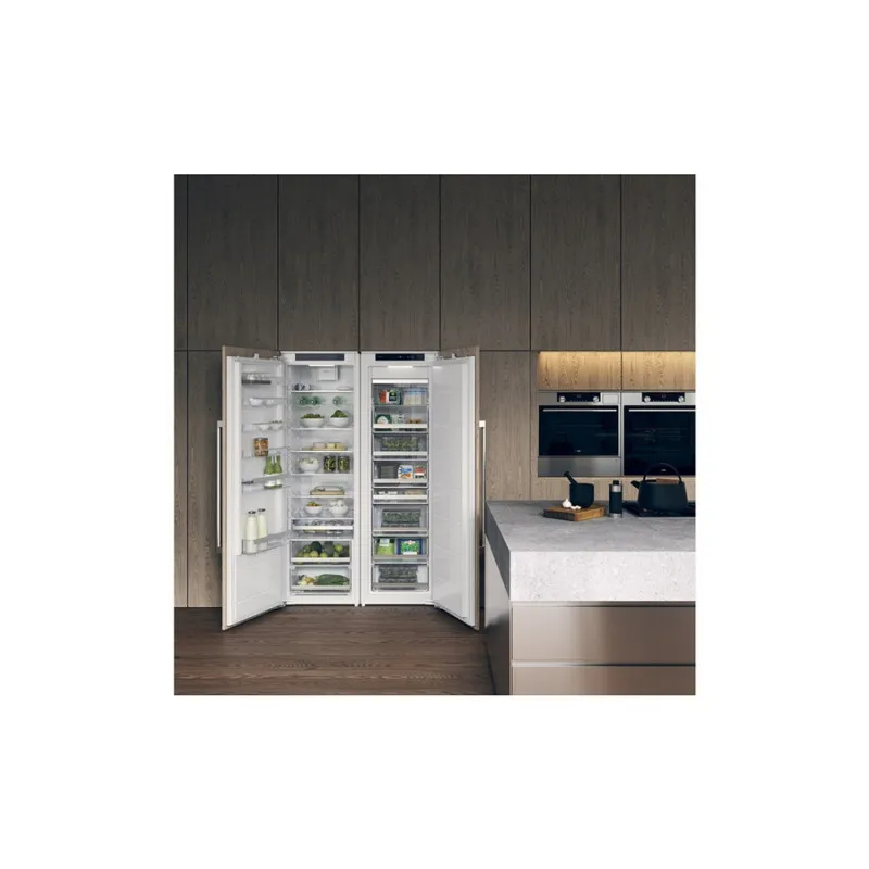 Ses dimensions d'encastrement 178 × 57 × 56 cm facilitent l'alignement dans une niche standard, tandis que la porte réversible avec système de pantographe assure un montage précis derrière la façade de cuisine. Les poignées intégrées et la ligne sobre et classique de l'enceinte s'intègrent harmonieusement aux meubles. L'éclairage LED intérieur apporte une visibilité immédiate sur l'ensemble des compartiments sans échauffement notable.