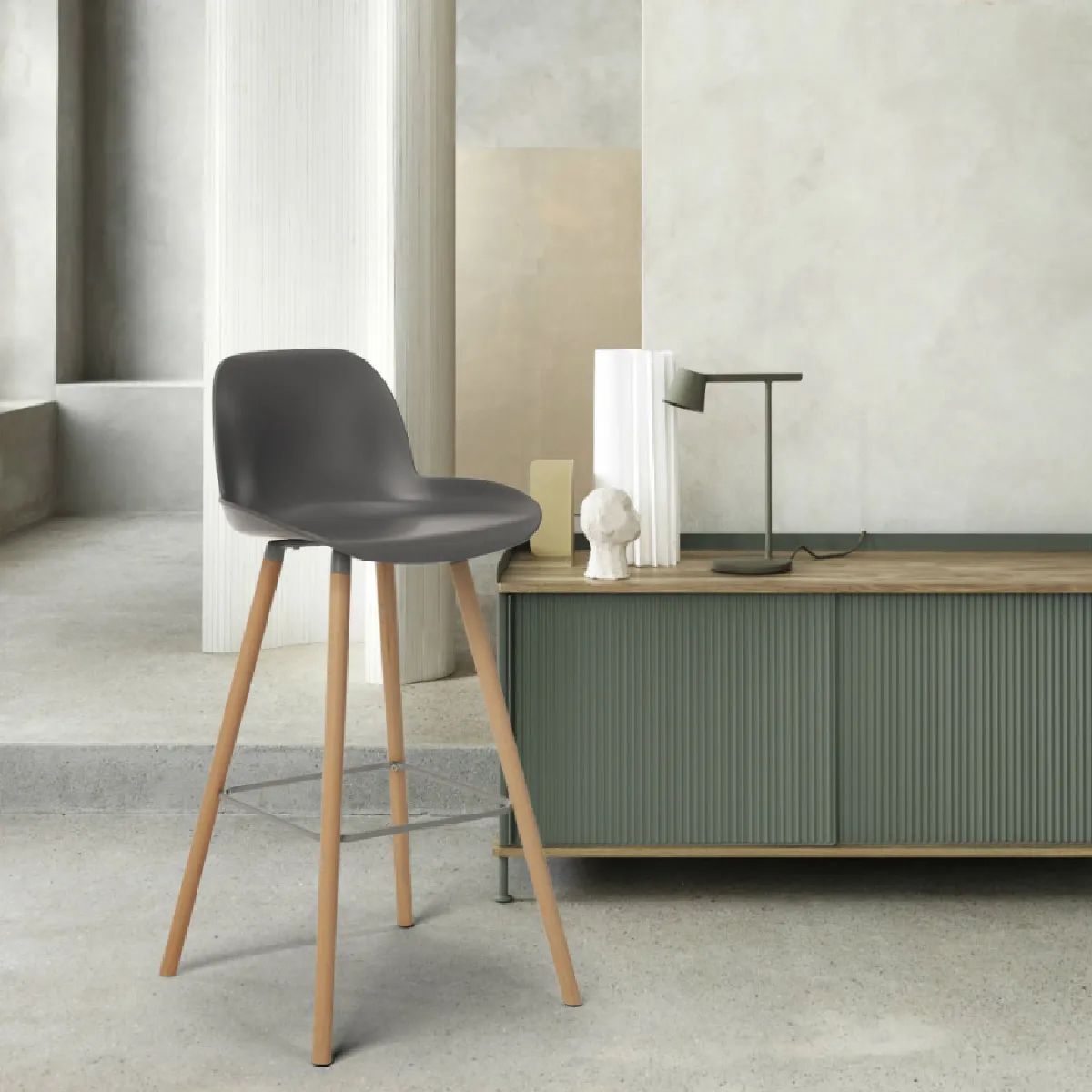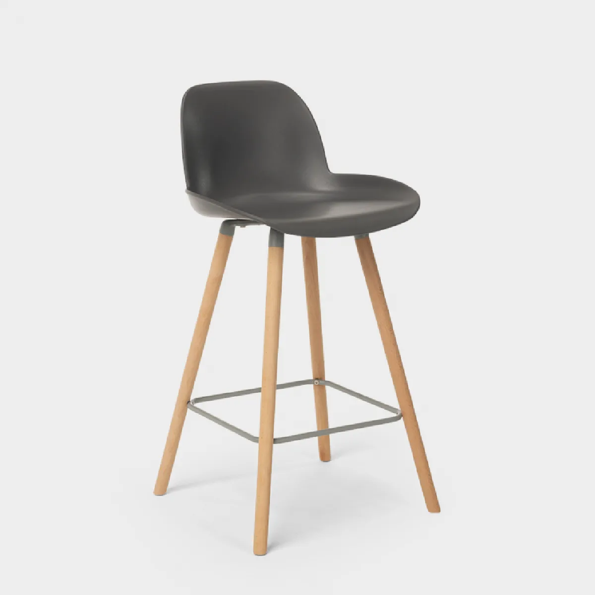 La coque en polypropylène assure une surface d'assise accueillante avec bords arrondis, limitant les points de pression pour rester à l'aise plus longtemps. La base en bois à quatre pieds adopte une géométrie inspirée du trépied pour une stabilité renforcée, complétée par une barre de repose-pieds périmétrique en aluminium. Cette association de matériaux favorise une tenue dans le temps adaptée à un usage domestique ou en espace de convivialité. La hauteur d'assise de 65 cm correspond aux comptoirs de cuisine intermédiaires et aux tables hautes compatibles.