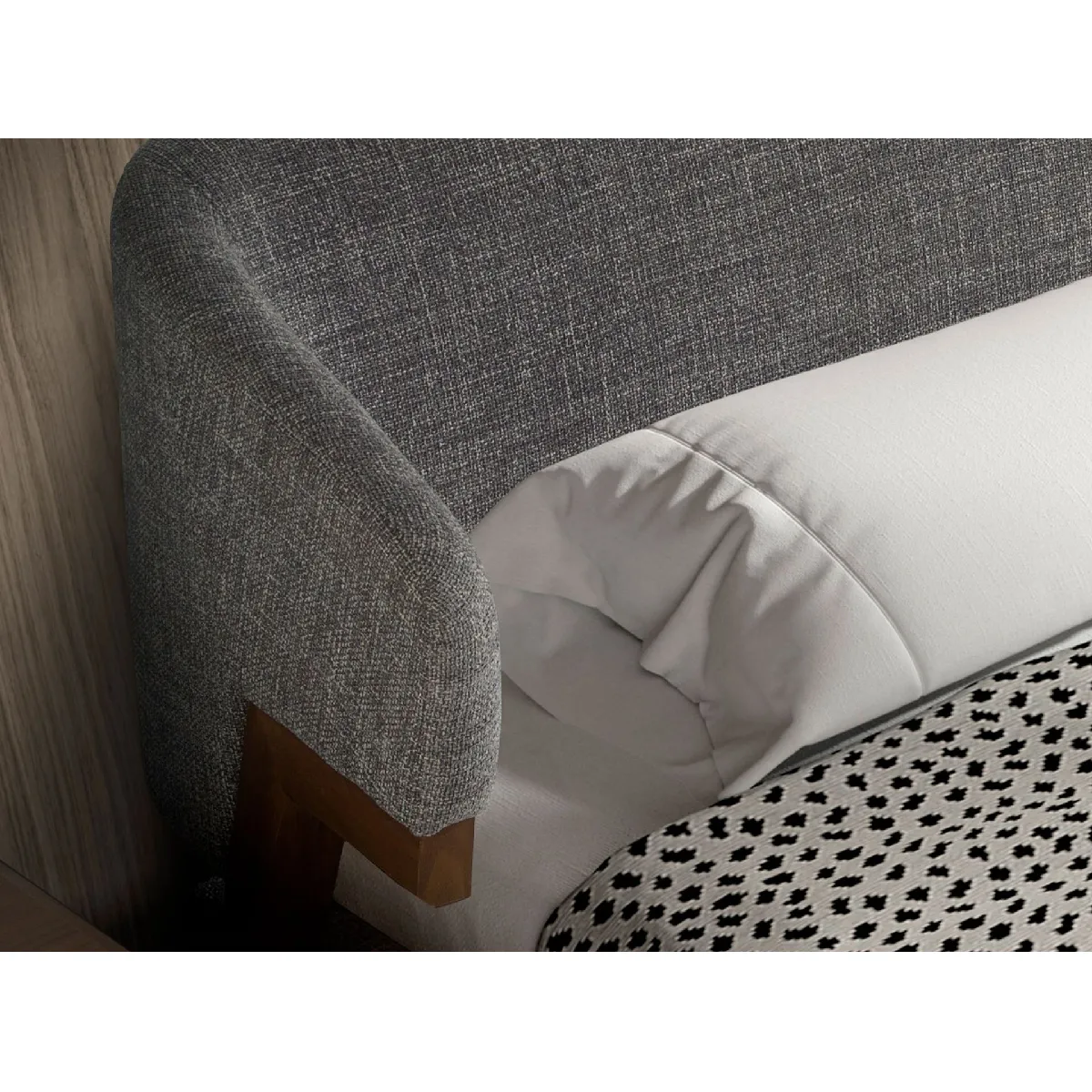 Lit double au design moderne avec une tête de lit originale et une structure en tissu gris, et des pieds en bois plaqué en noyer naturel. Une pièce maîtresse pour votre chambre à coucher avec laquelle vous donnerez un style élégant et accueillant.