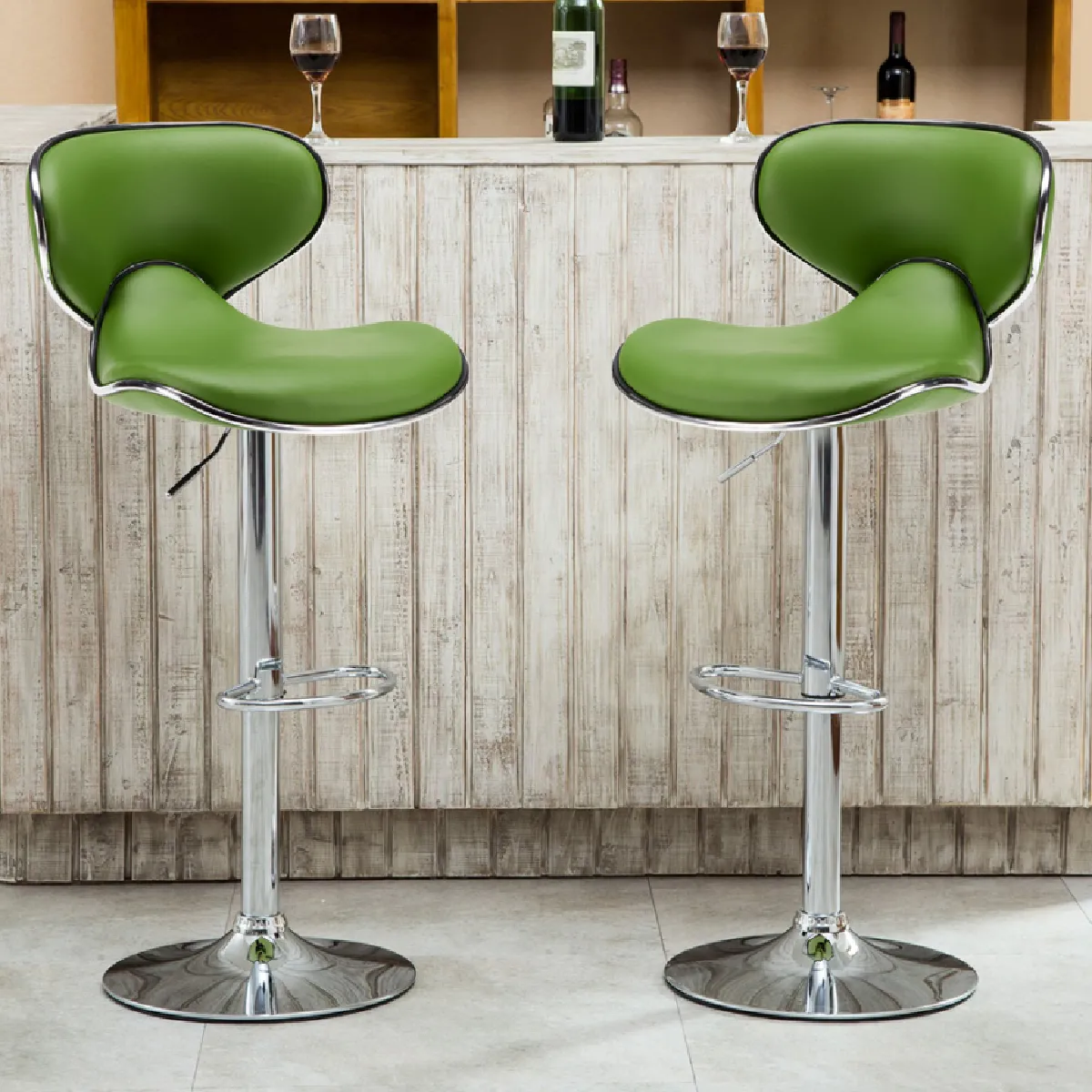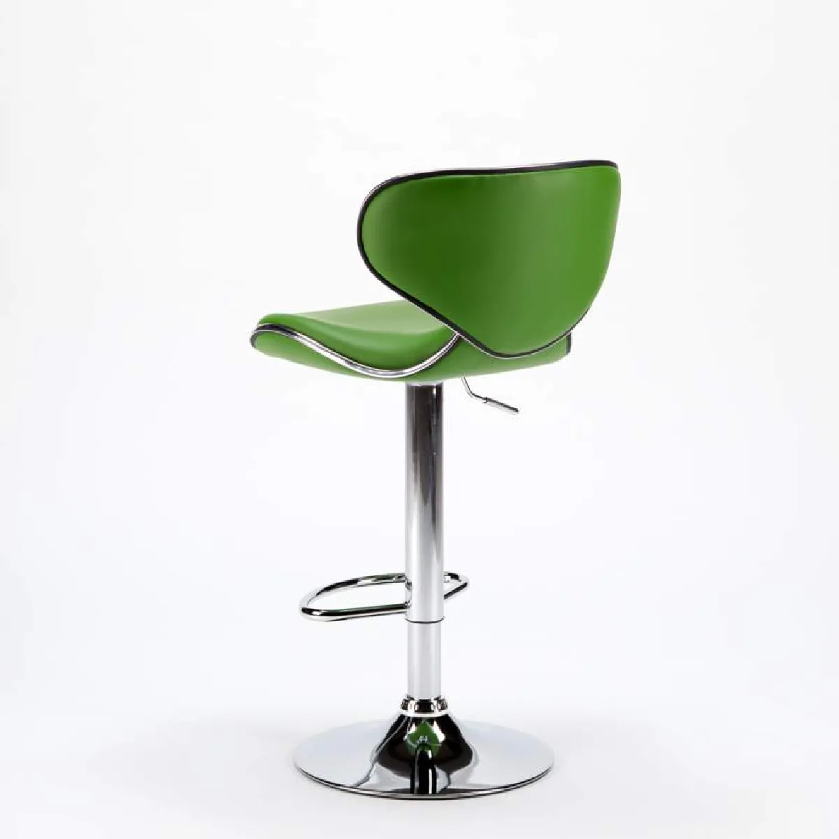 Le piètement en métal chromé repose sur une base circulaire de 38,5 cm de diamètre pour plus de stabilité, limitant les oscillations lors des mouvements. Le repose-pieds incurvé en demi-lune offre un appui naturel qui répartit la pression des jambes. Le revêtement en similicuir vert se nettoie aisément, ce qui convient aux usages fréquents en intérieur domestique comme dans des espaces accueillant du public.