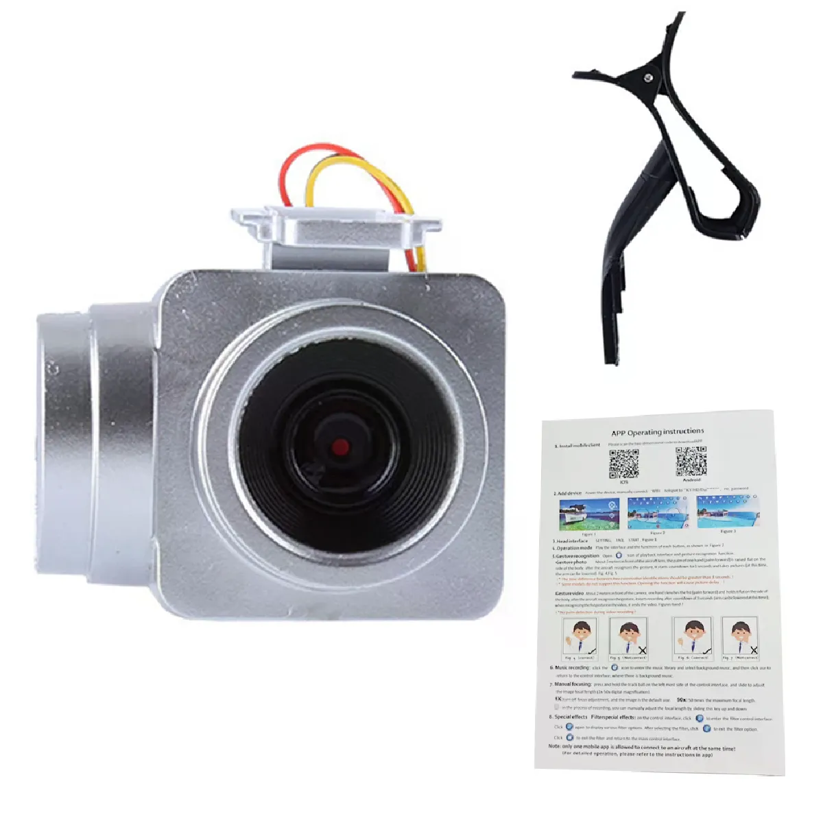 Description:Material: Made of plastic material, which is durable, wear-resisting, sturdy and eco-friendly.Features: 3 hundred thousand HD real time wide angle wifi camera, that can the amazing pictures and videos from the sky.Real Time Viewing: The phone can be connected to the WIFI signal emitted by the camera to get the picture, and the picture and video can be saved directly to the phone.With real time transmission, you can enjoy the pictures in time.Function: Support mobile phone remote control, trajectory stroke, voice control, gesture photo.Aerial Photography Accessories: Specially designed for RC quadrotor, easy to install and remove.Specification:Material: PlasticColor: SilverSize(LxWxH): About 4.5x3.2x3.4cm/1.77x1.26x1.34inchPixel: 3 hundred thousandResolution: 640x368Package includes:1pc x Camera1pc x Mobile phone holder1pc x User manual