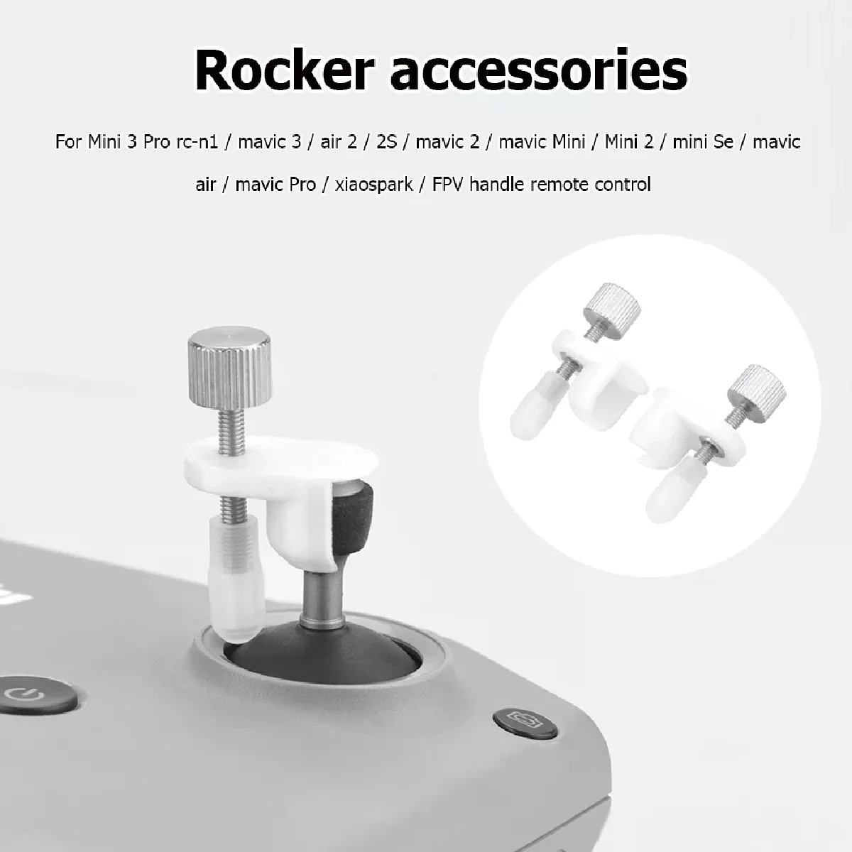 2pcs RC Écran Télécommande À Bascule Vitesse Titulaire Joystick Thumb Stick Fixe Vitesse Moyenne Croisière Support pour DJI MINI 3 PRO RC-N1 Drone Accessoires BlancCaractéristique:1. La manette de commande du drone peut être fixé à un angle à travers la vis bouton;2. Faire le drone voler à une vitesse fixe, qui est pratique pour time-lapse tir;3. Petit et léger, facile à transporter.Spécification:Nom: Adapté pour Mini 3 pro RC-N1 joystick de contrôle de vitesse supportModèles concernés: pour Mini 3 pro RC-N1 /Mavic 3/Air 2/2S/Mavic 2/Mavic Mini/Mini 2/Mini SE/Mavic Air/Mavic Pro/Xiao Spark/FPV contrôleur télécommandeMatériel principal: plastique + métalCouleur: blancPoids Net: 11.1gPoids brut: 12.5gProduit taille: 3.5x2.1x1.3cm/1.38x0.83x0.51inEmballage taille: 12.8x 8cm/5.04x3.15inMéthode d'emballage: sacNote:La