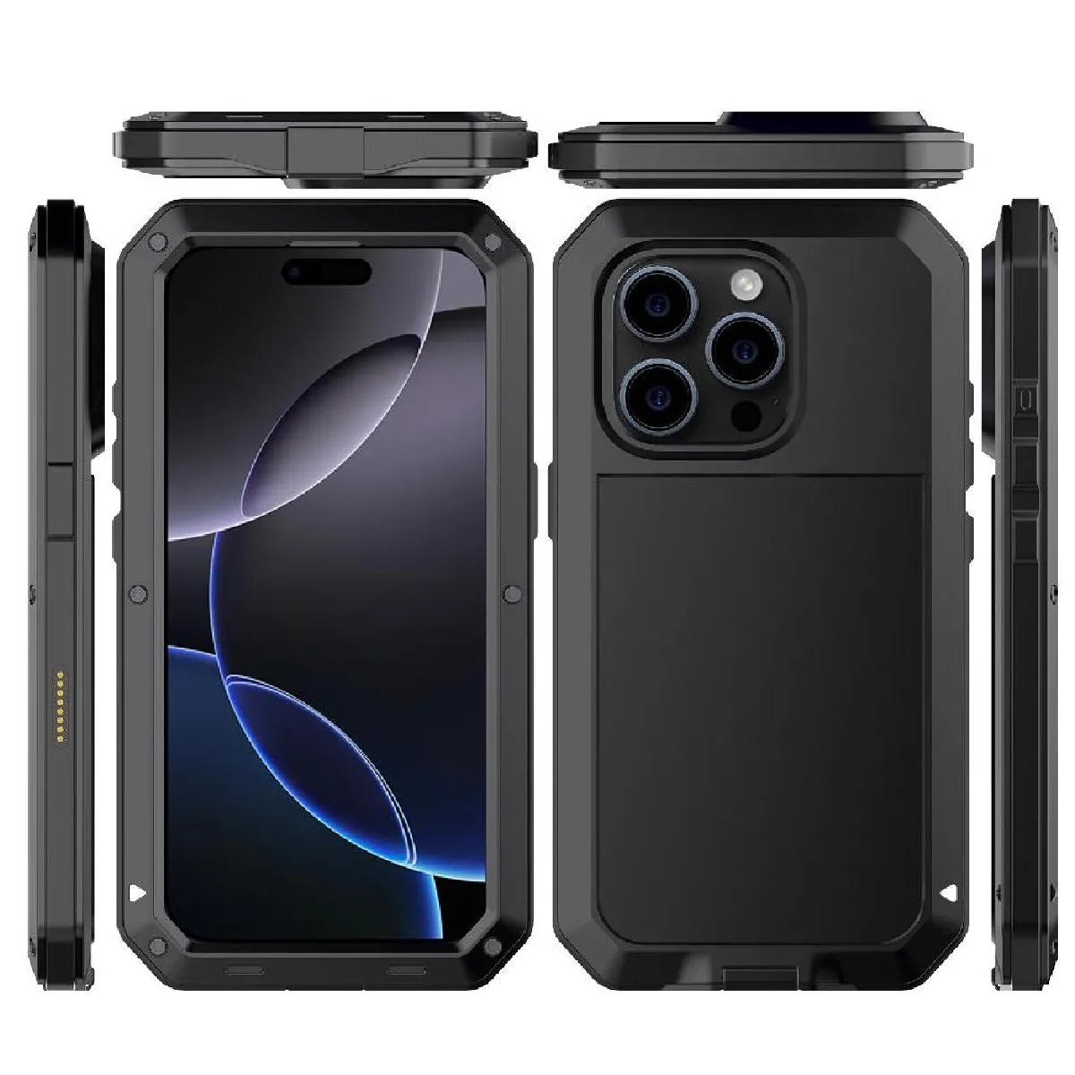 Coque pour Étui Pour IPhone 16 ProMax Résistant Aux Chocs Boîtier En Métal D'alliage D'aluminium Preuve De Poussière Sports De Plein Air Housse De Protection Intégrale 360 GANGXUN Noir