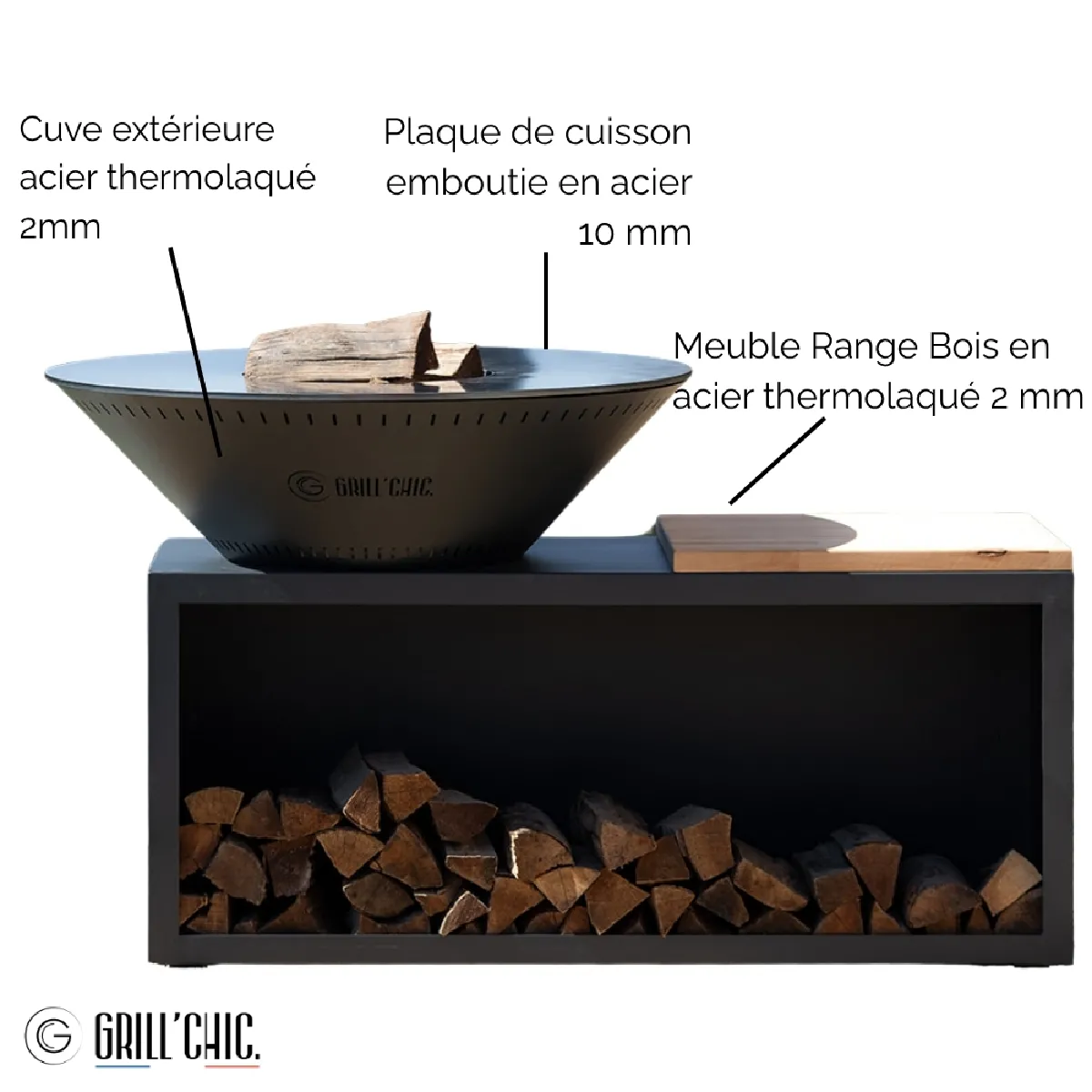 Commentaire vendeur : DESCRIPTION DU PRODUITLe brasero plancha TRADITIONNEL de Grill’Chic offre une expérience de cuisson extérieure authentique et chaleureuse. Conçu en acier Corten (2?mm), il allie robustesse, durabilité et élégance. Disponible en format rond (Ø?83?cm ou Ø?103?cm) ou carré, il intègre une plaque emboutie en acier de 10?mm pour une cuisson homogène. Proposé avec ou sans rangement bois intégré, il convient à tous les styles d’aménagement. Grâce à ses 4 pieds réglables, il reste stable sur toutes les surfaces. Ce brasero est fabriqué en France et garanti 2?ans. Dessiné pour accueillir jusqu’à 10 convives, il offre une surface de cuisson généreuse de 0,45?m² (Ø?83?cm).AVANTAGES DU PRODUITLe TRADITIONNEL garantit une cuisson performante grâce à sa plaque épaisse de 10?mm, parfaite pour griller sans déformation. Le Corten se patine naturellement et résiste aux intempéries, tandis que l’acier thermolaqué offre une finition durable sans oxydation, et l’aluminium thermolaqué assure légèreté et modernité. Avec rangement bois, il combine esthétique et praticité (meuble 123?×?52?×?64?cm + planche bois 51?×?60?cm), ou version minimaliste pour plus de mobilité. Léger (113?kg monté), il intègre une grille offerte, reste stable grâce à ses 4 pieds réglables, et est livré pré-monté.CARACTÉRISTIQUES TECHNIQUES :- Formes : Rond Ø?83?cm (0,45?m², H?90?cm) ou Ø?103?cm, et Carré- Matériaux : Acier Corten 2?mm.- Plaque cuisson : Acier embouti Ø?83?c...
