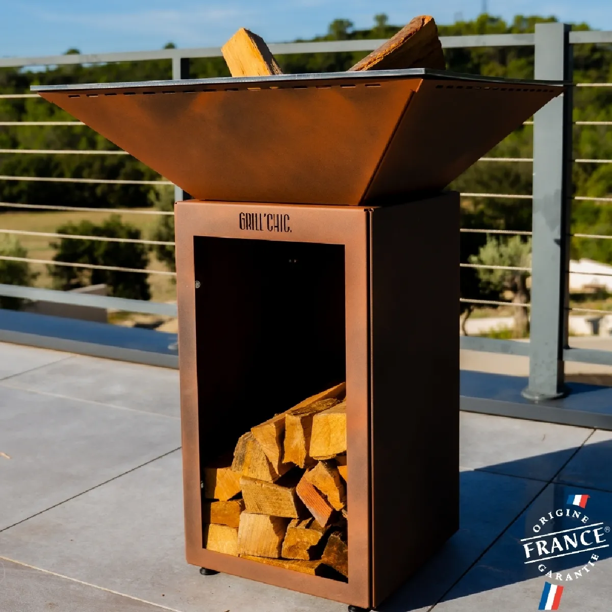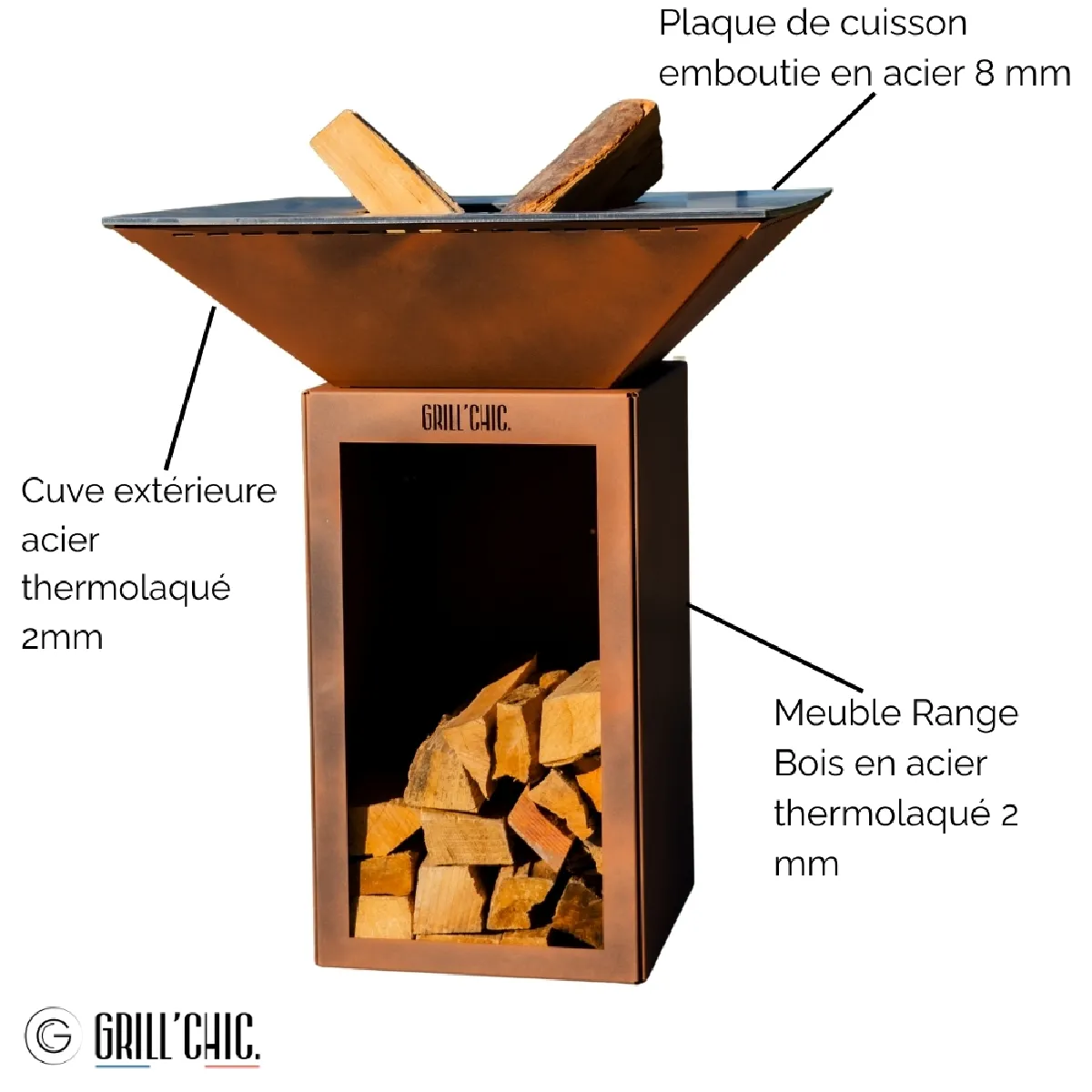 Commentaire vendeur : DESCRIPTION DU PRODUITDécouvrez le brasero plancha CEVENOL Double Cuve en Acier Thermolaqué 100?% Made in France par GRILL CHIC, disponible en 4 coloris élégants. Sa double cuve en acier thermolaqué et ses 4 pieds réglables offrent robustesse et stabilité. La plaque emboutie en acier de 8?mm (74?×?74?cm) garantit une cuisson uniforme, parfaite pour 6 à 8 convives. Option de rangement bois intégrée ou version minimaliste.AVANTAGES DU PRODUIT- Cuisson polyvalente (grill, rôtissage et plancha) grâce à la plaque épaisse de 8?mm- Acier thermolaqué, résistant aux intempéries- Pieds réglables pour une parfaite stabilité sur tous types de sols- Option rangement bois intégrée pour allier esthétique et praticité- Conçu pour 6 à 8 personnes, idéal pour des moments conviviaux inoubliables- Fabrication française avec garantie 2 ans, livré à monterCARACTÉRISTIQUES TECHNIQUES- Forme : Carrée (74?×?74?cm, hauteur 90?cm)- Matériaux : Cuve foyer inox 2?mm + cuve extérieure acier thermolaqué 2?mm + meuble range bois acier thermolaqué 2?mm- Plaque cuisson : acier embouti de 8?mm – excellente répartition thermique- Surface de cuisson : 0,45?m²- Hauteur de cuisson : 90?cm- Pieds : 4 pieds réglables- Coloris : Imitation Corten- Autres coloris disponibles : Noir 9005 / Gris Anthracite 7016 / Rouge- Capacité : 6 à 8 personnes- Versions : Avec ou sans rangement bois- Livraison : À monter- Fabrication et garantie : France, 2?ans