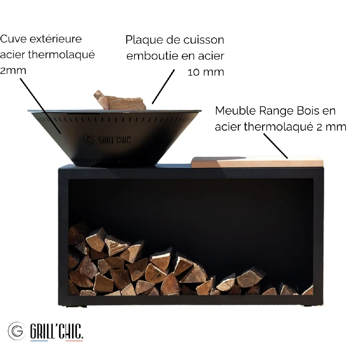 Commentaire vendeur : DESCRIPTION DU PRODUITLe brasero plancha TRADITIONNEL de Grill’Chic offre une expérience de cuisson extérieure authentique et chaleureuse. Conçu en acier Corten (2?mm), il allie robustesse, durabilité et élégance. Disponible en format rond (Ø?83?cm ou Ø?103?cm) ou carré, il intègre une plaque emboutie en acier de 10?mm pour une cuisson homogène. Proposé avec ou sans rangement bois intégré, il convient à tous les styles d’aménagement. Grâce à ses 4 pieds réglables, il reste stable sur toutes les surfaces. Ce brasero est fabriqué en France et garanti 2?ans. Dessiné pour accueillir jusqu’à 10 convives, il offre une surface de cuisson généreuse de 0,45?m² (Ø?83?cm).AVANTAGES DU PRODUITLe TRADITIONNEL garantit une cuisson performante grâce à sa plaque épaisse de 10?mm, parfaite pour griller sans déformation. Le Corten se patine naturellement et résiste aux intempéries, tandis que l’acier thermolaqué offre une finition durable sans oxydation, et l’aluminium thermolaqué assure légèreté et modernité. Avec rangement bois, il combine esthétique et praticité (meuble 123?×?52?×?64?cm + planche bois 51?×?60?cm), ou version minimaliste pour plus de mobilité. Léger (113?kg monté), il intègre une grille offerte, reste stable grâce à ses 4 pieds réglables, et est livré pré-monté.CARACTÉRISTIQUES TECHNIQUES :- Formes : Rond Ø?83?cm (0,45?m², H?90?cm) ou Ø?103?cm, et Carré- Matériaux : Acier Corten 2?mm- Plaque cuisson : Acier embouti Ø?83?cm...