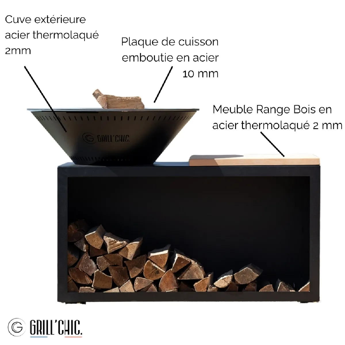 Commentaire vendeur : DESCRIPTION DU PRODUITLe brasero plancha TRADITIONNEL de Grill’Chic offre une expérience de cuisson extérieure authentique et chaleureuse. Conçu en acier Corten (2?mm), il allie robustesse, durabilité et élégance. Disponible en format rond (Ø?83?cm ou Ø?103?cm) ou carré, il intègre une plaque emboutie en acier de 10?mm pour une cuisson homogène. Proposé avec ou sans rangement bois intégré, il convient à tous les styles d’aménagement. Grâce à ses 4 pieds réglables, il reste stable sur toutes les surfaces. Ce brasero est fabriqué en France et garanti 2?ans. Dessiné pour accueillir jusqu’à 10 convives, il offre une surface de cuisson généreuse de 0,45?m² (Ø?83?cm).AVANTAGES DU PRODUITLe TRADITIONNEL garantit une cuisson performante grâce à sa plaque épaisse de 10?mm, parfaite pour griller sans déformation. Le Corten se patine naturellement et résiste aux intempéries, tandis que l’acier thermolaqué offre une finition durable sans oxydation, et l’aluminium thermolaqué assure légèreté et modernité. Avec rangement bois, il combine esthétique et praticité (meuble 123?×?52?×?64?cm + planche bois 51?×?60?cm), ou version minimaliste pour plus de mobilité. Léger (113?kg monté), il intègre une grille offerte, reste stable grâce à ses 4 pieds réglables, et est livré pré-monté.CARACTÉRISTIQUES TECHNIQUES :- Formes : Rond Ø?83?cm (0,45?m², H?90?cm) ou Ø?103?cm, et Carré- Matériaux : Acier Corten 2?mm.- Plaque cuisson : Acier embouti Ø?83?c...