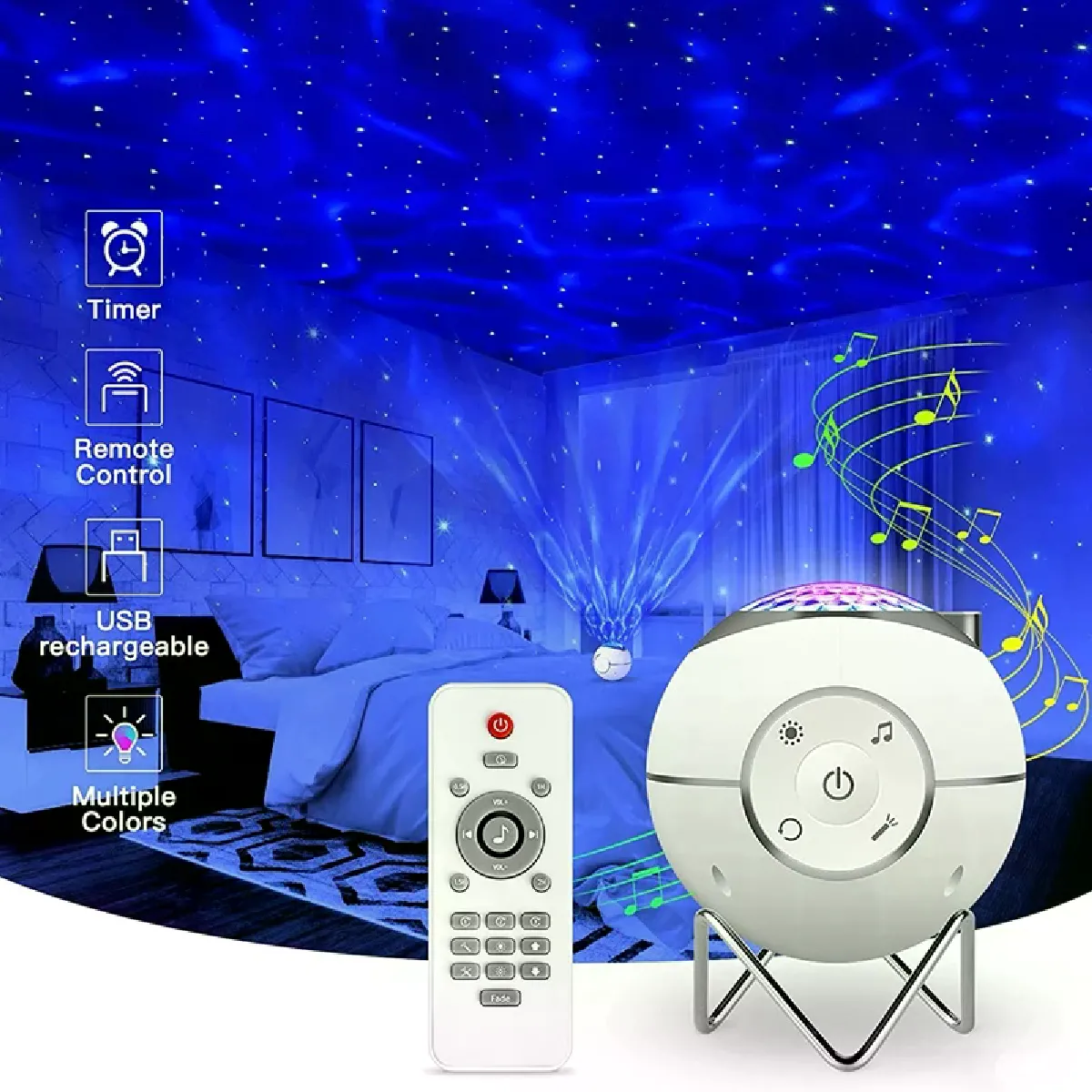 Projecteur d'étoiles, projection de planètes de galaxie, lumière rotative à 360 °, nébuleuse, nuage, lampe de nuit étoilée [Projecteur d'étoiles de veilleuse] le projecteur d'étoiles peut simuler le ciel étoilé à travers des projections de 14 modes, 8 luminosité et 3 vitesses. Et grâce à une rotation à 360 °, il apporte de magnifiques projections de vagues de l'océan, de nébuleuses et d'aurore. Choisissez différents modes d'éclairage pour différentes scènes et atmosphères. Il fonctionne également comme une veilleuse unique. Un excellent cadeau de noël pour les enfants![Télécommande et minuterie d'arrêt automatique] vous pouvez facilement changer le mode via la télécommande pour personnaliser vos besoins (2 piles AAA non incluses). Changer la couleur/vitesse/luminosité de la lumière d'onde, changer l'interrupteur des lumières d'effet spécial rouge et vert (Notez que les lumières d'effet spécial vertes sont fixées au mode de respiration de 20s). Réglez le mode musique/volume/Flash, réglez 0.5h/1h/1.5h/2h pour éteindre automatiquement le projecteur de ciel étoilé.[Projecteur étoile Rechargeable USB] batterie intégrée de 1800 mAh, peut être utilisée pendant plus de 6 heures avec une charge complète (2 heures de charge recommandées), vous pouvez charger votre projecteur d'étoiles par alimentation mobile, ordinateur portable, chargeur mural et chargeur de voiture, très pratique à transporter, sentir le beau ciel étoilé à tout moment et n'importe où, Le corps compact le rend très approprié pour les voyages, le camping, les réunions ou la décoration de fête.[Luminosité réglable et 5 chansons de bruit blanc] choisissez votre style préféré dans le motif rouge, bleu, vert, blanc ou multicolore et choisissez la luminosité et la vitesse d'écoulement souhaitées. Et vous pouvez choisir votre musique préférée, avec une musique de haute qualité et un ciel étoilé, vous pouvez profiter d'une atmosphère détendue et confortable.[Cadeau parfait pour les enfants et la