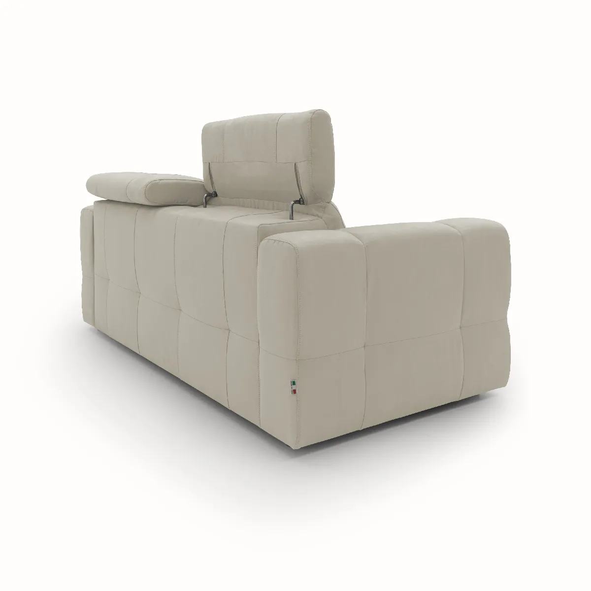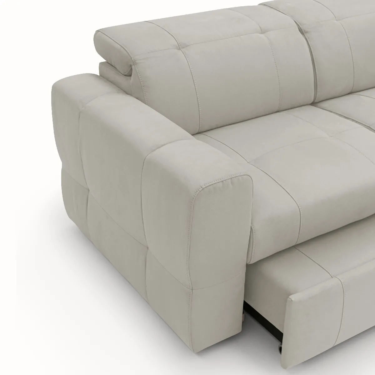 L'esthétique contemporaine s'allie à des détails rappelant le capitonné classique, avec des coutures visibles qui parcourent sièges, accoudoirs, dossier et pouf. Cette continuité visuelle facilite une mise en valeur au centre du salon, chaque face conservant une finition nette. Le pouf s'ouvre via une poignée en tissu et prolonge l'assise pour varier les positions de repos ou créer rapidement une zone d'allongement. Les têtières à réglage en sept niveaux permettent d'adapter le soutien cervical pour travailler sur tablette, regarder un film ou échanger en toute aisance.