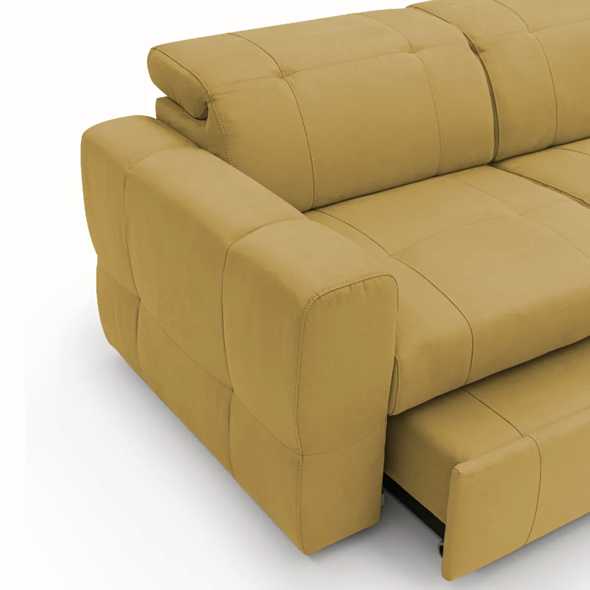 Le pouf extractible augmente l'espace d'assise et permet de se détendre avec une surface d'allonge généreuse pour les jambes. Les têtières réglables sur sept niveaux offrent un maintien précis de la nuque selon l'activité, que ce soit lecture, échange ou film. Le revêtement en microfibre à effet alcantara, lavable et déperlant, aide à garder un canapé propre au quotidien avec entretien simplifié. Les coutures apparentes valorisent un travail soigné visible sur toutes les faces, pour une mise en valeur même au centre de la pièce. Les pieds en caoutchouc protègent les sols sensibles pour une intégration facile sur parquet et surfaces délicates.
