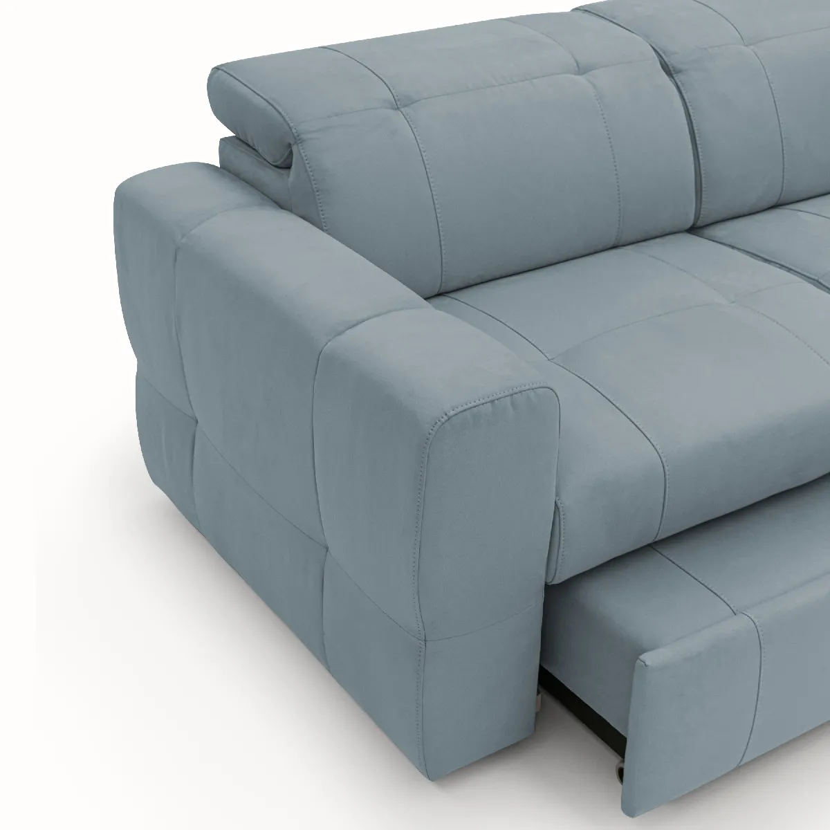 Les finitions sont mises en avant par des coutures continues sur sièges, accoudoirs, têtières et pouf, permettant également une installation au centre de la pièce. Les pieds en caoutchouc limitent les marques au sol pour un usage serein sur parquet. L'ensemble privilégie une esthétique sobre avec bleu gris et texture veloutée, tandis que les déclinaisons 2 et 3 places optimisent l'occupation de l'espace selon la configuration du salon.