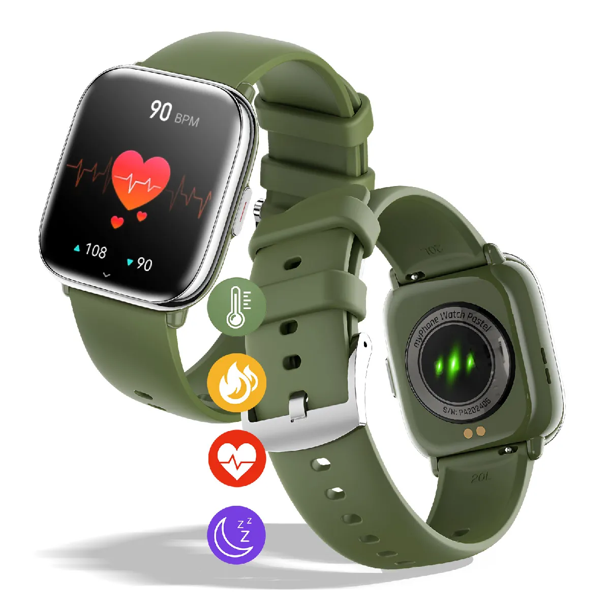 Montre connectée myPhone Pastel. Écran AMOLED 1,75" avec Always on Display (390 x 450 pixels). Appels Bluetooth et notifications en temps réel. Suivi santé : fréquence cardiaque, oxygène sanguin, tension artérielle, sommeil. Design métallique raffiné et bracelet silicone. Résistance IP67. Batterie 230 mAh avec 5 à 7 jours d'autonomie.