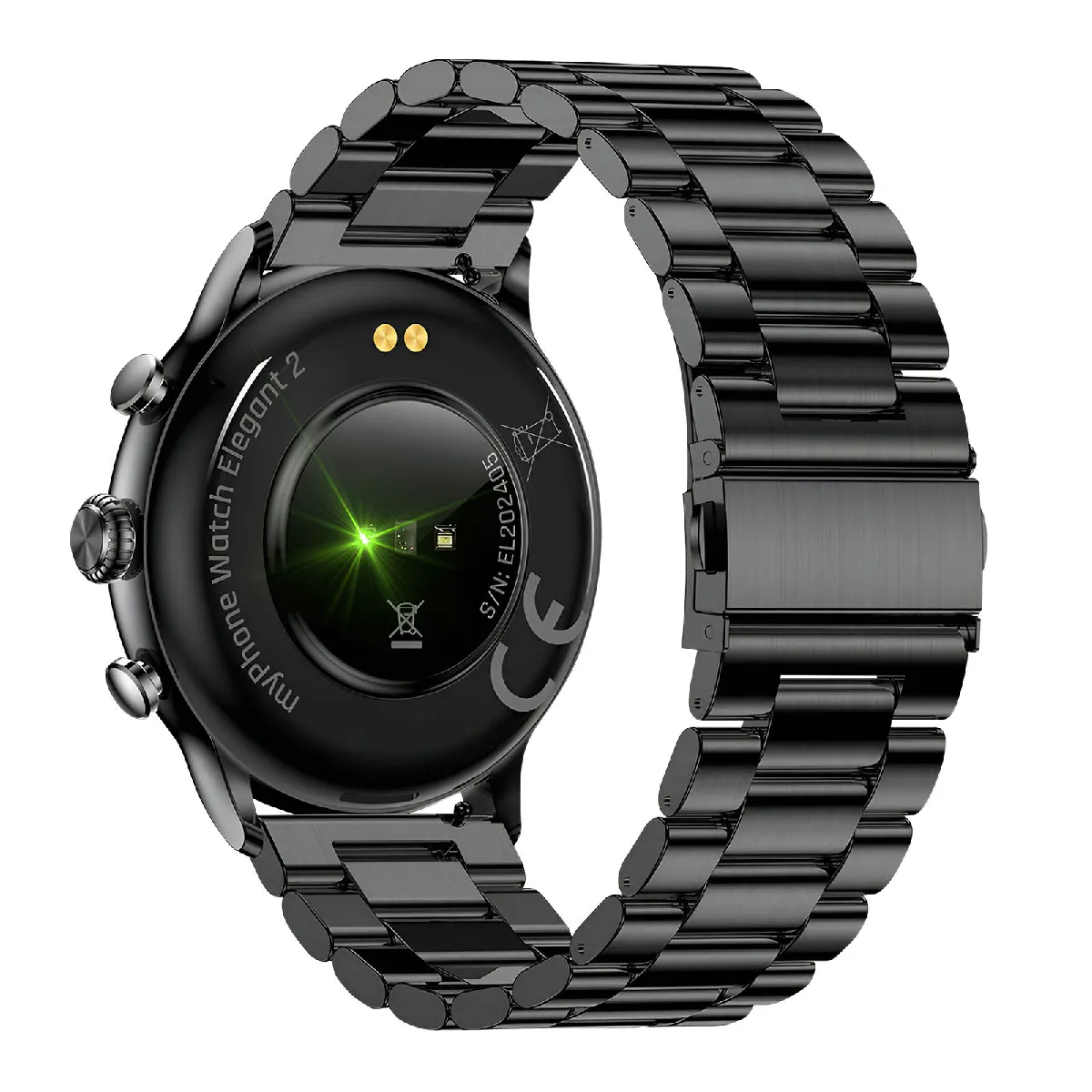 Montre Connectée myPhone Watch Elegant 2. Écran AMOLED 1,43". Fonction Always-On Display. Appels Bluetooth intégrés. Boîtier métallique raffiné. Résistance IP67 : protégé contre l'eau et la poussière. Surveillance avancée de la fréquence cardiaque. Batterie longue durée offrant jusqu'à 7 jours d'autonomie. Interface intuitive avec couronne rotative et boutons latéraux ergonomiques.