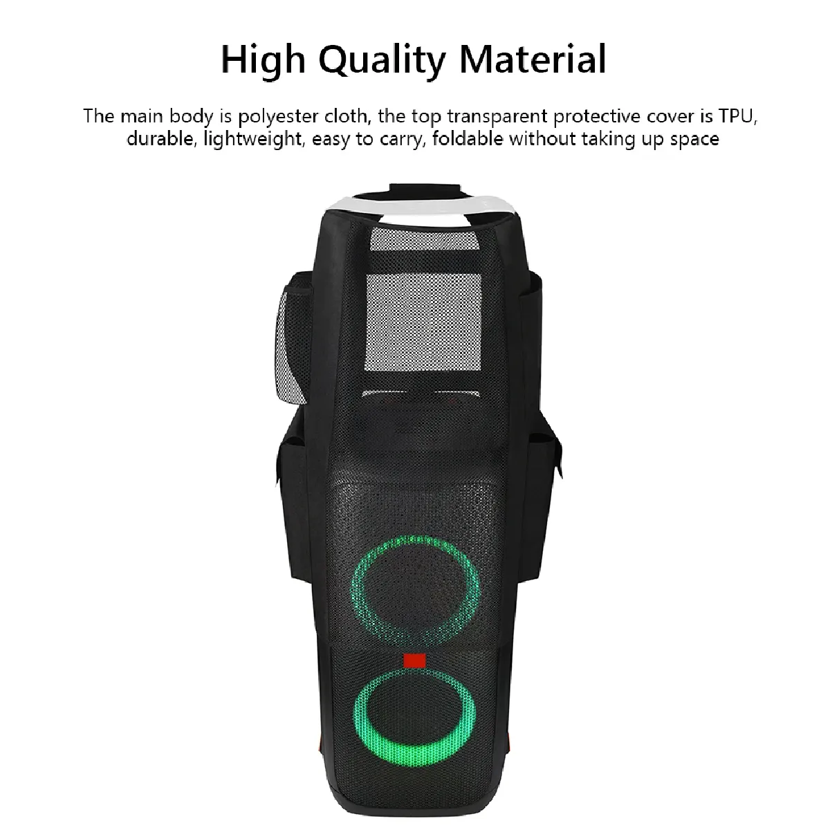 La housse offre une protection complète contre la poussière, l'eau, les rayures et les UV afin de préserver l'enceinte au quotidien. Le dessus transparent en TPU permet de garder une vue sur les commandes, tandis que le tissu en polyester léger et pliable facilite le transport et le stockage sans encombrement. Le système de fixation avec ruban élastique autocollant maintient l'ensemble en place, pour une installation simple et rapide sur la JBL Partybox 310 lors des déplacements ou du rangement à la maison.