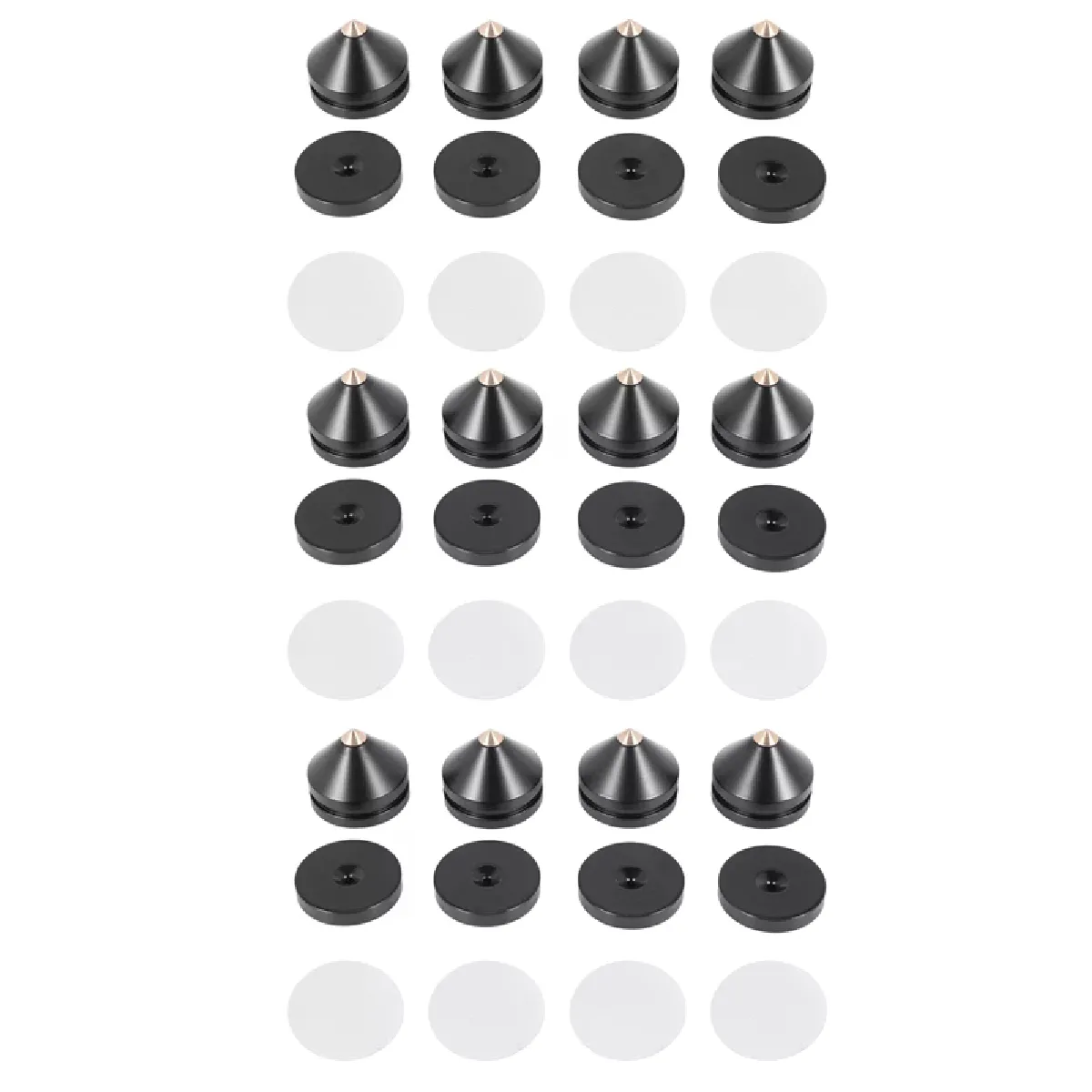 Le lot comprend 12 tampons et 12 pointes pour équiper plusieurs appareils ou former des ensembles stables. Les dimensions compactes facilitent l'intégration : diamètre tampon 23 mm, hauteur 4 mm ; diamètre pointe 23 mm, hauteur 20 mm. La finition noire s'accorde discrètement avec la plupart des configurations. La construction en alliage robuste pour un appui rigide et durable permet de maintenir l'enceinte fermement tout en limitant les transmissions au sol, pour une écoute plus nette et confortable.