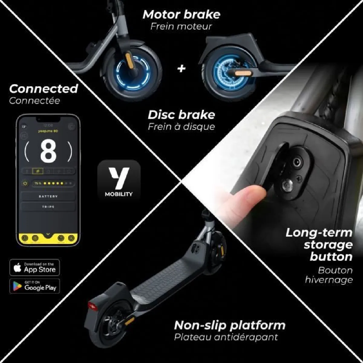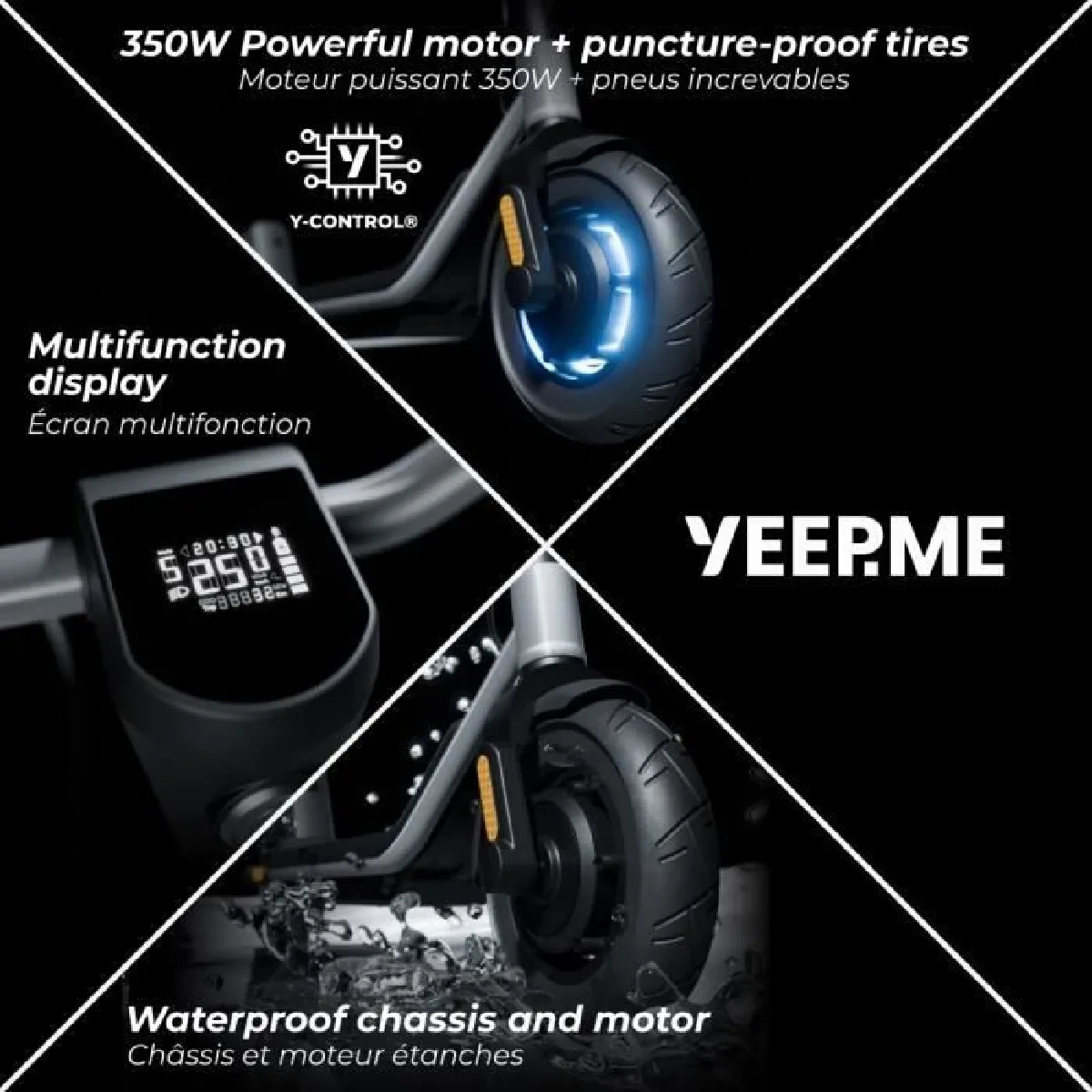 Trottinette Puissante, Robuste et Polyvalente + Puissante : 350W + Sûre : double frein, tapis antidérapant + Robuste : châssis renforcé en acier, étanchéité IPX6 + Sécurisée : démarrage par clé et application *** Garantie 5 ans offerte *** Roues 8