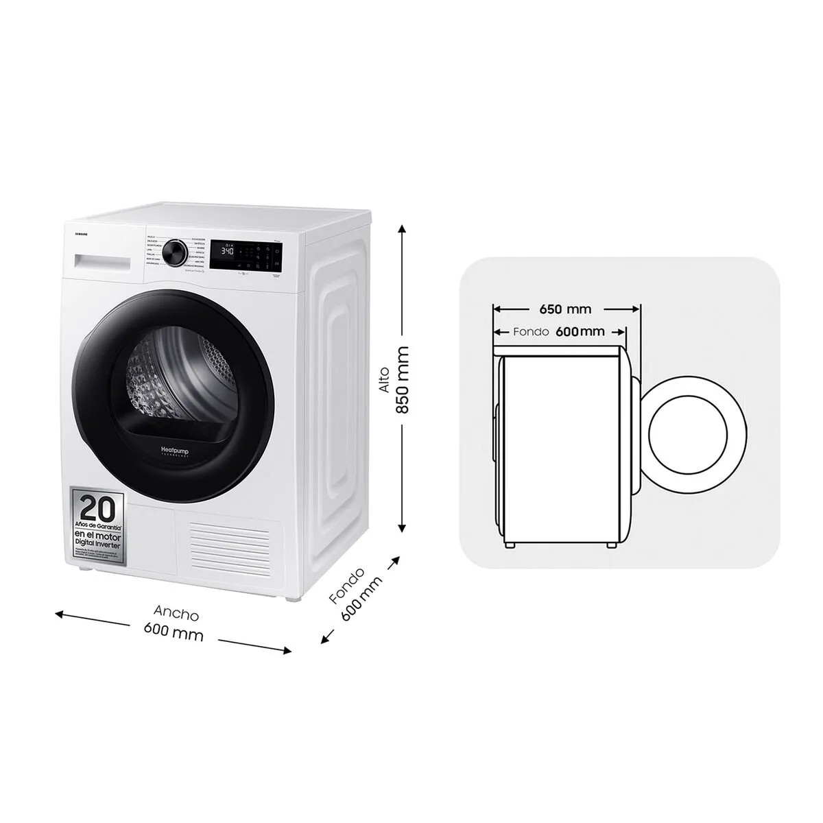 - Type : Sèche-linge à pompe à chaleur, pose libre, hublot frontal