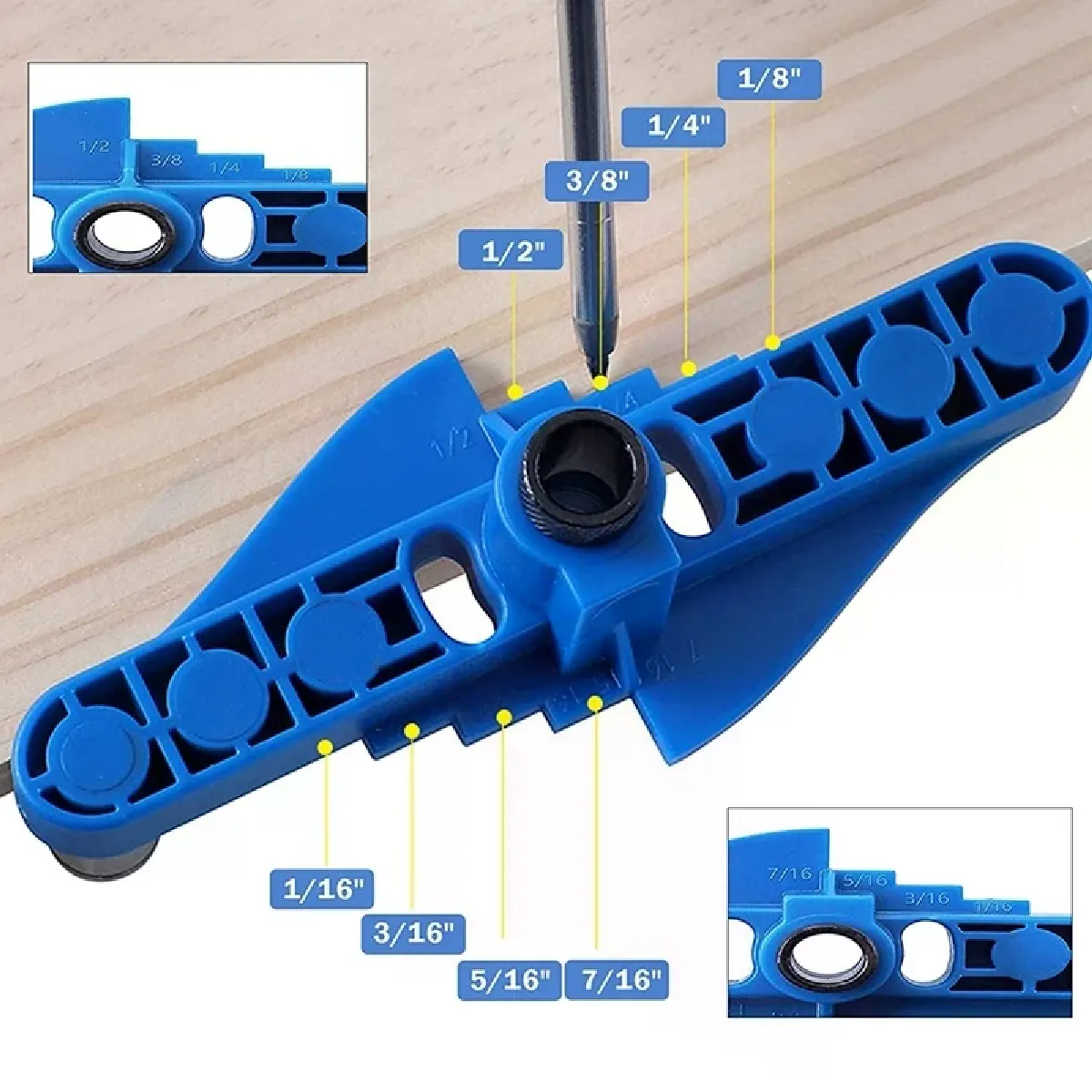 Les douilles de guidage acceptent des forets de 6 mm, 8 mm et 10 mm pour le perçage dans le bois. L'échelle de marquage claire permet de tracer rapidement des repères au bord en 1/16, 3/16, 5/16, 7/16, 1/8, 1/4, 3/8 et 1/2 pouces. La fonction de graveur central intégrée facilite le marquage des lignes centrales sur chant et sur face. Conçu pour les assemblages par chevilles et le positionnement de trous verticaux répétés, ce guide de perçage assure des perçages droits et des repères reproductibles.