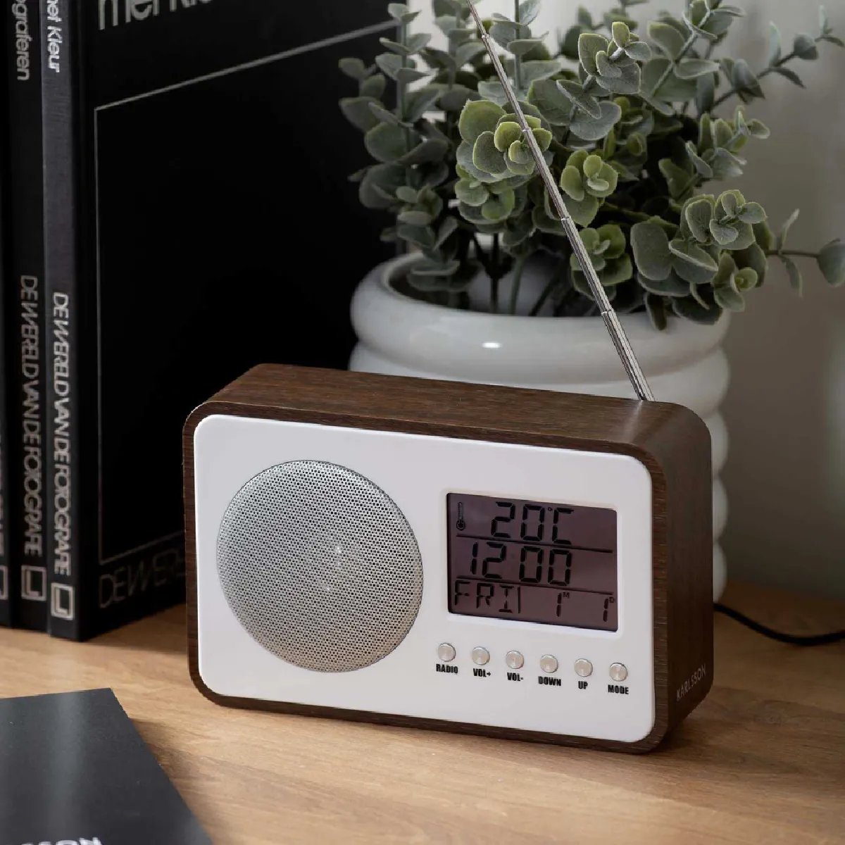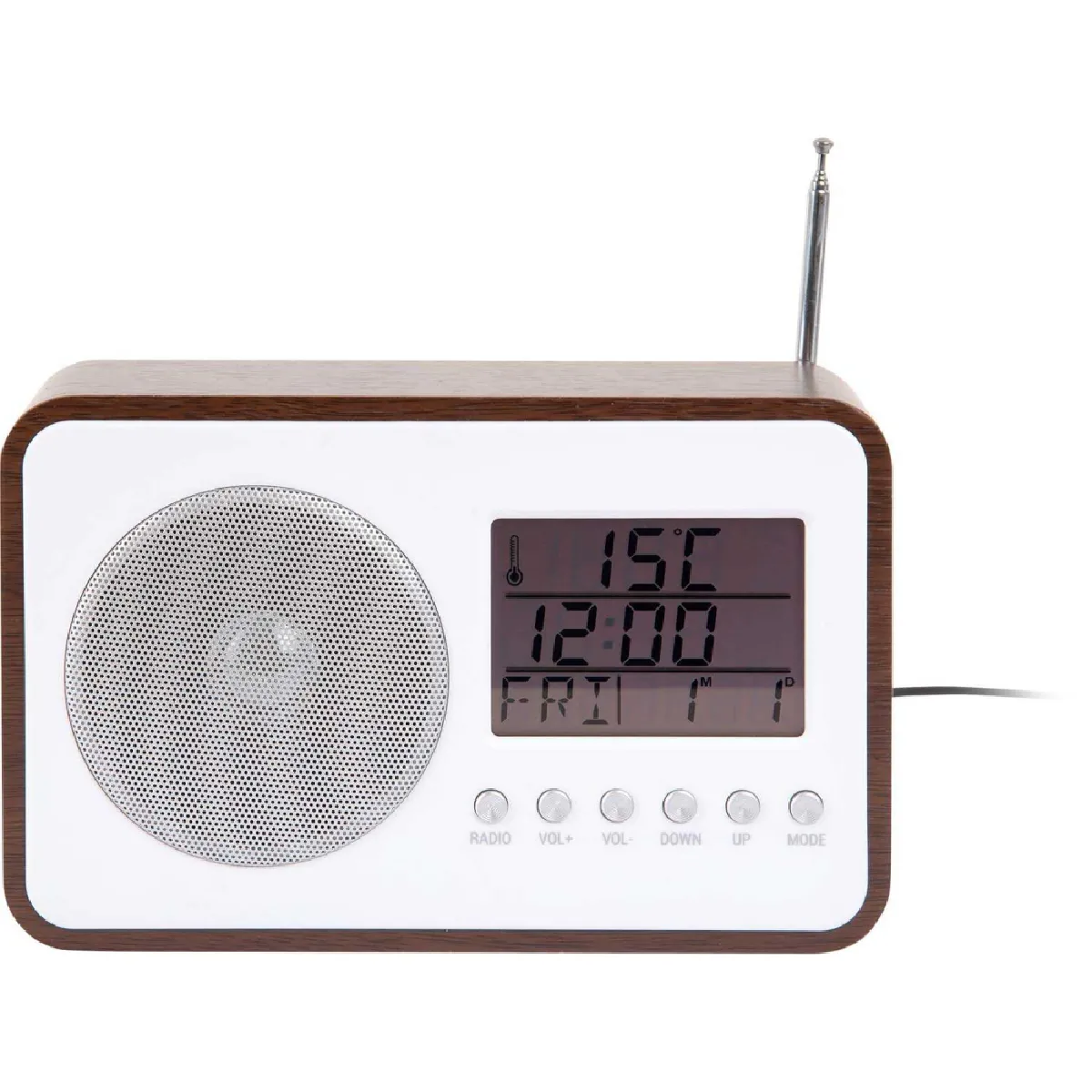 Réveil avec radio FM - MDF - Température, heure, date affichage - Piles AA - Marron