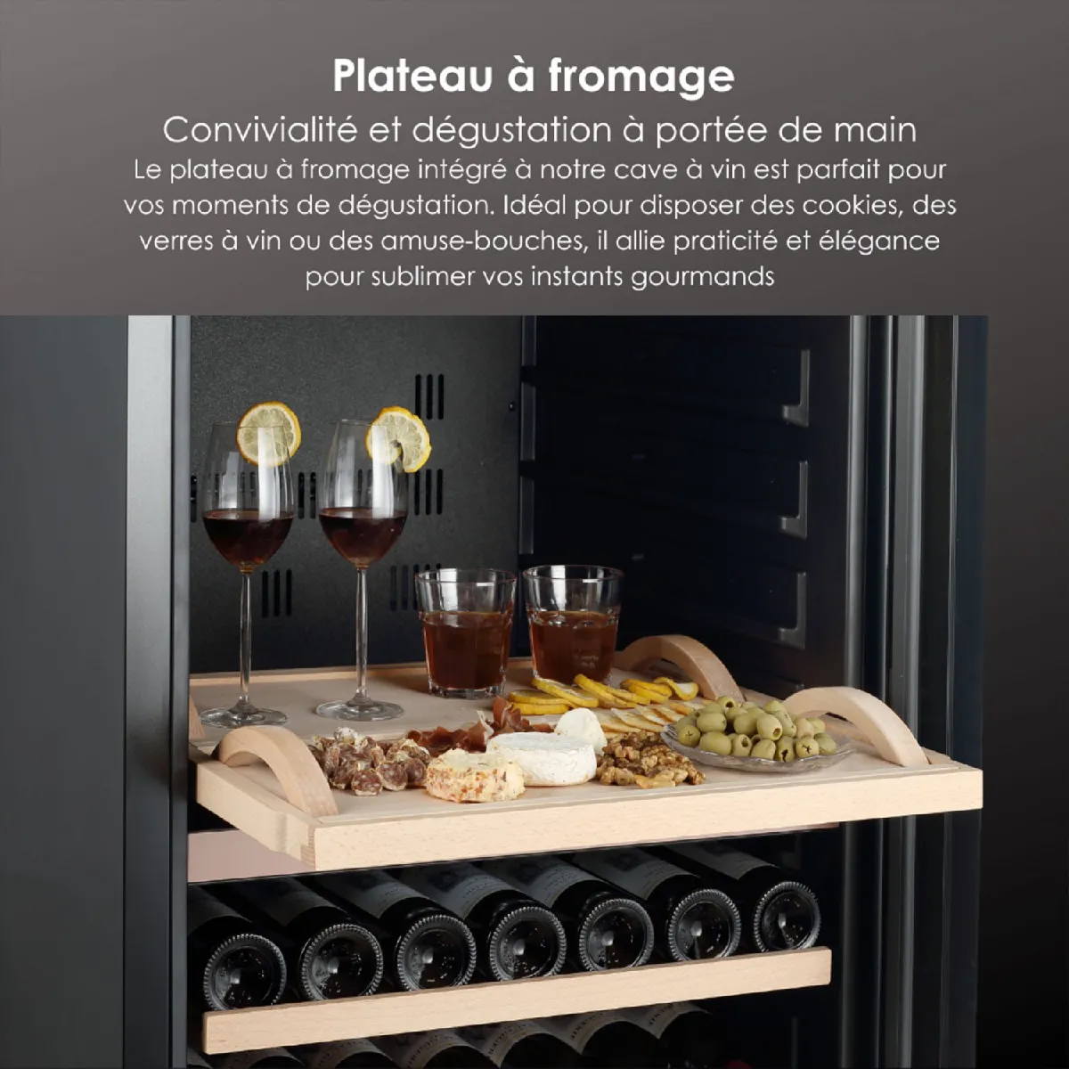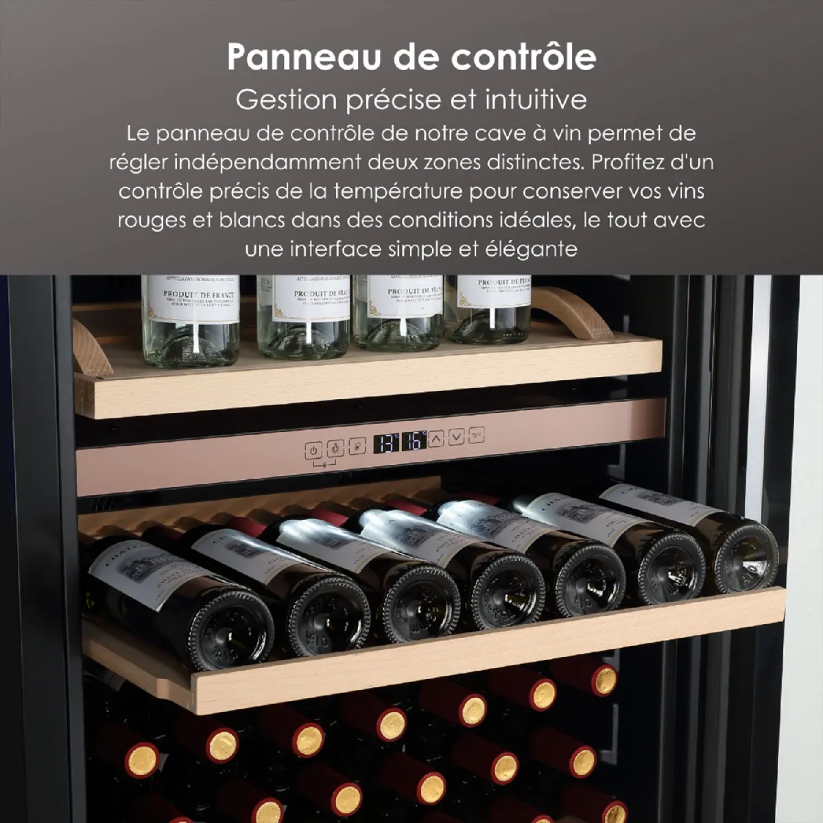 Les deux compartiments offrent des plages dédiées : 512 °C pour blancs et effervescents et 1220 °C pour rouges. La commande électronique en façade règle chaque zone de façon indépendante, avec affichage clair de la température intérieure. Le froid ventilé et le condenseur intérieur assurent une stabilité thermique et une humidité homogène dans toute la cavité. La technologie antivibration, associée aux clayettes en bois de hêtre, limite les micromouvements et aide à préserver l'intégrité des arômes. Le filtre à charbon contribue à maintenir un air propre, tandis que le double vitrage antiUV protège des rayonnements et de la lumière directe.
