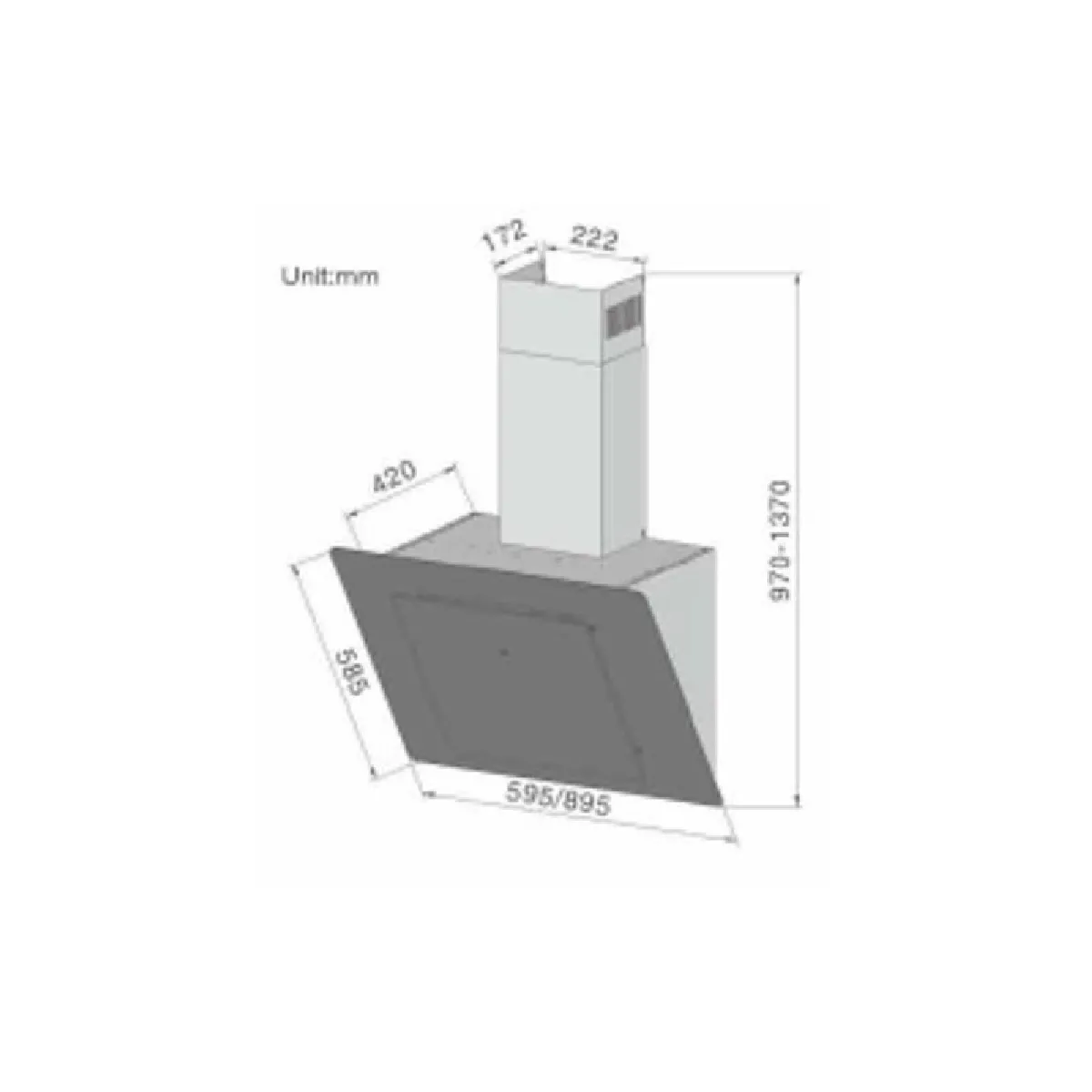 La hotte mesure 137 cm de hauteur, 60 cm de largeur et 42 cm de profondeur. Le mode de traitement est en évacuation vers l'extérieur.