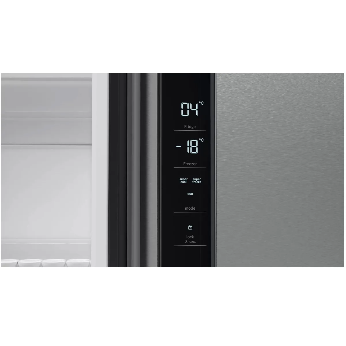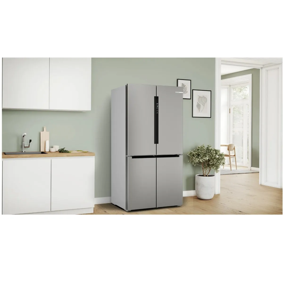 La façade en acier brossé anti-traces avec côtés silver s'intègre dans de nombreux styles de cuisine. Les portes à charnières gauche et droite et les poignées intégrées favorisent une prise en main naturelle tout en conservant une ligne épurée. Les dimensions de 183 x 90.5 x 73.1 cm et le format multi-portes facilitent l'accès aux zones utilisées au quotidien. Le froid ventilé dans les deux cavités et le dégivrage automatique côté réfrigérateur réduisent la maintenance régulière. L'appareil n'est pas connecté, ce qui simplifie la mise en service et l'usage courant.
