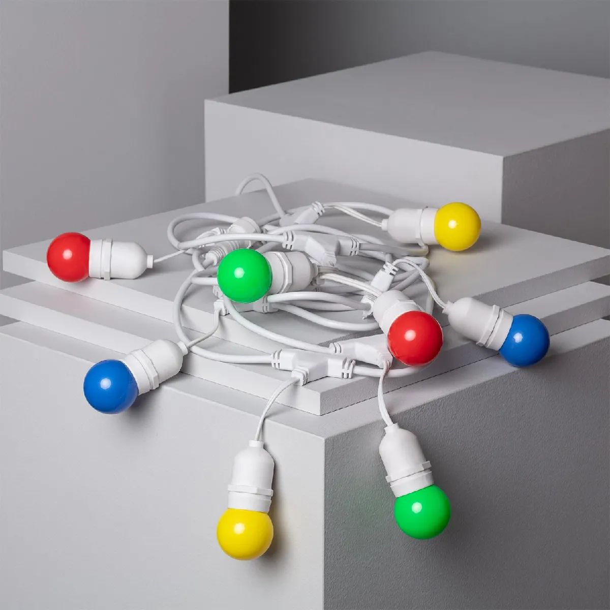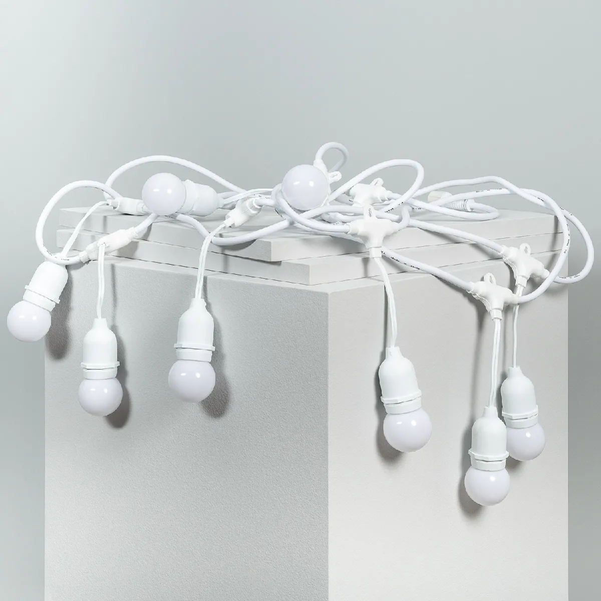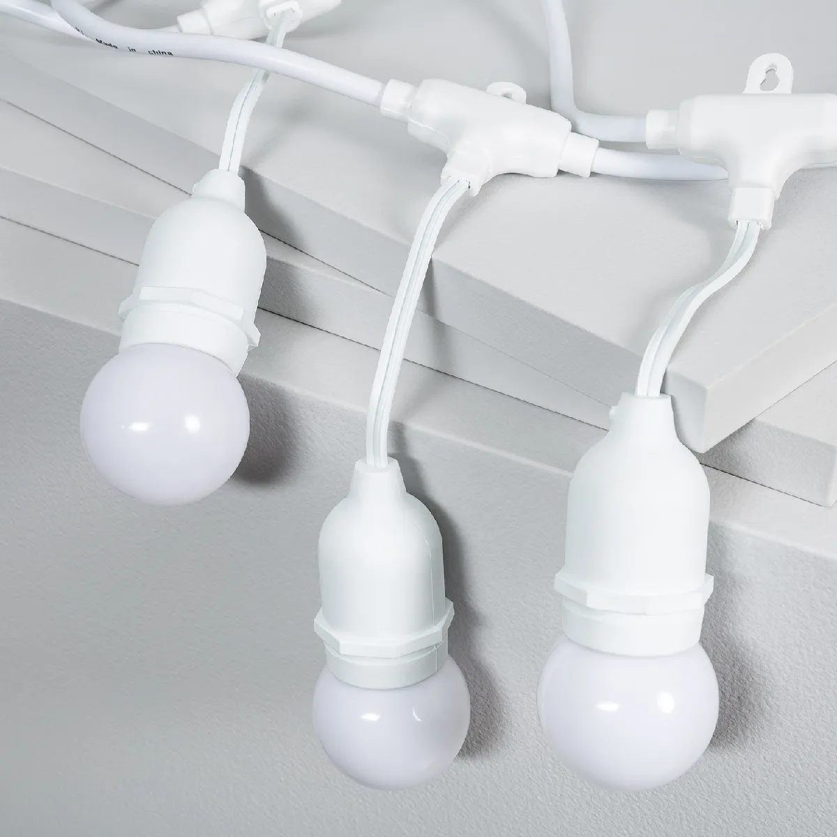 Ce Kit Guirlande Waterproof 5.5m Blanche + 8 Ampoules LED E27 G45 3W est un élément largement utilisé dans l'éclairage décoratif extérieur. La guirlande a des connecteurs aux extrémités qui peuvent être utilisés à la fois comme alimentation ou pour brancher les guirlandes en série. vous pourrez unir jusqu'à 6 guirlandes formant une chaîne de 30 mètres de long et 48 ampoules. Entre chaque ampoule se trouve une longueur de 60cm.