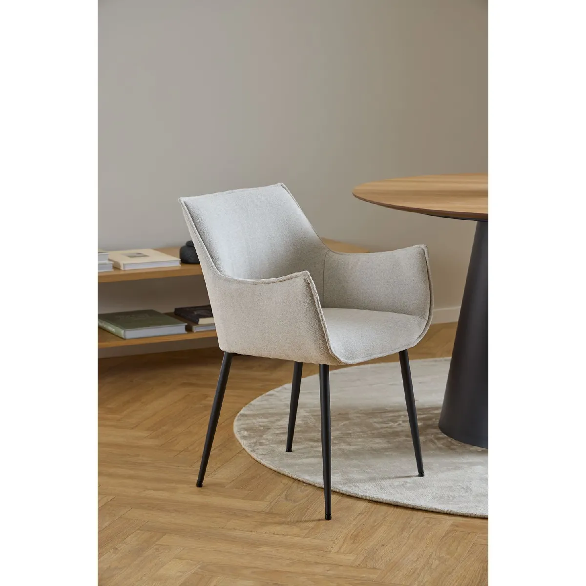 La chaise Sorrento allie simplicité et élégance avec ses accoudoirs raffinés et son revêtement structuré. Les coutures ajoutent une touche de sophistication, tandis que ses lignes épurées et son caractère accessible lui permettent de s'intégrer harmonieusement dans divers styles d'intérieur.