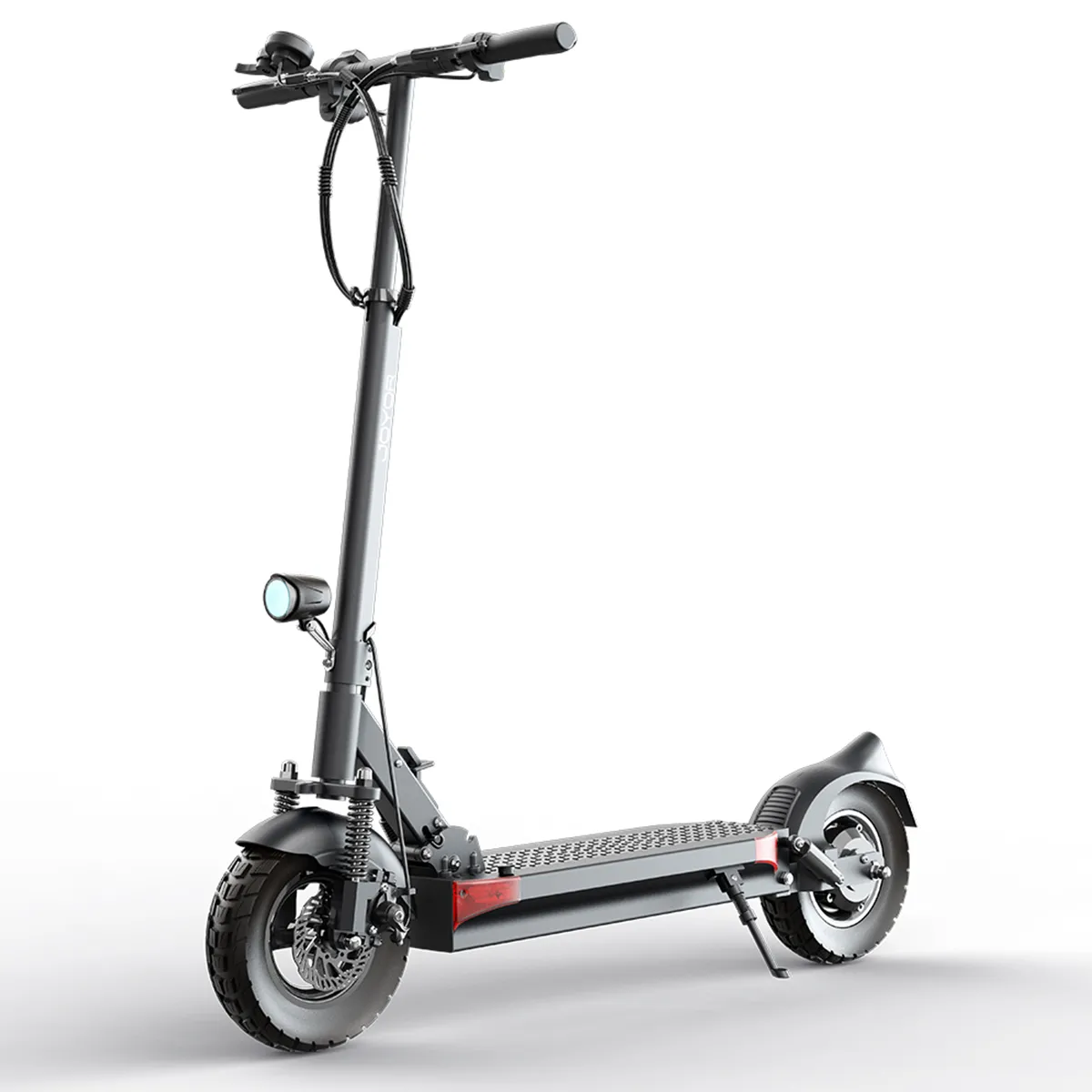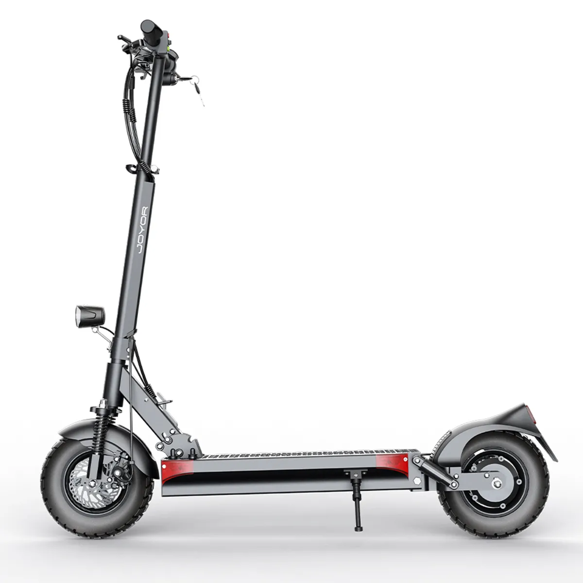 The Joyor Y6-S is designed for off-road terrain with 10-inch tires featuring anti-skid treads, a strengthened hydraulic shock absorption system, and a high-torque trail ratio motor. It offers seamless performance on rough terrain, making it ready for adventure straight out of the box.