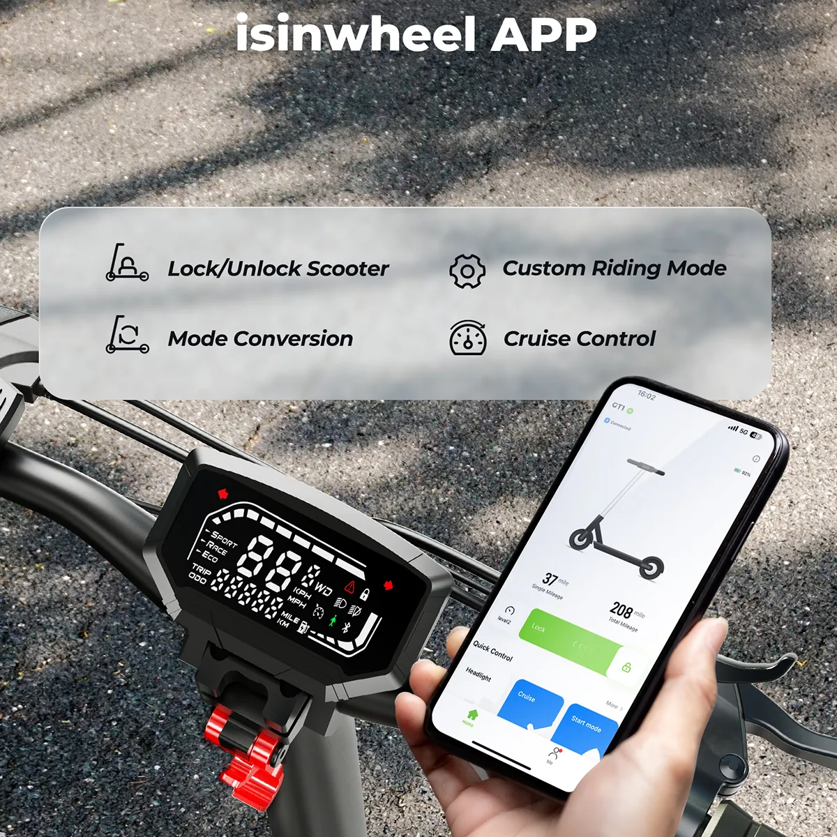 Connectez la trottinette à l'application isinwheel pour un démarrage en une seule touche, une fonctionnalité antivol et des modes de conduite personnalisés, offrant une expérience personnalisable et sécurisée.