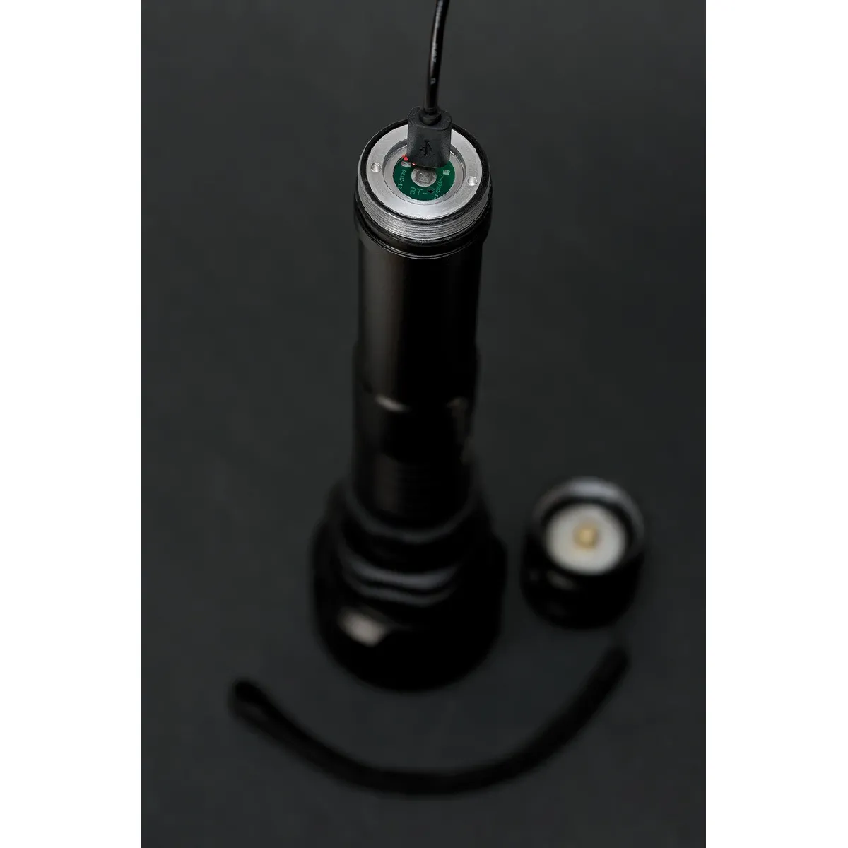 La lampe de poche est rechargeable via une batterie Li-Ion (3,7V/4,0Ah) intégrée avec témoin de charge.