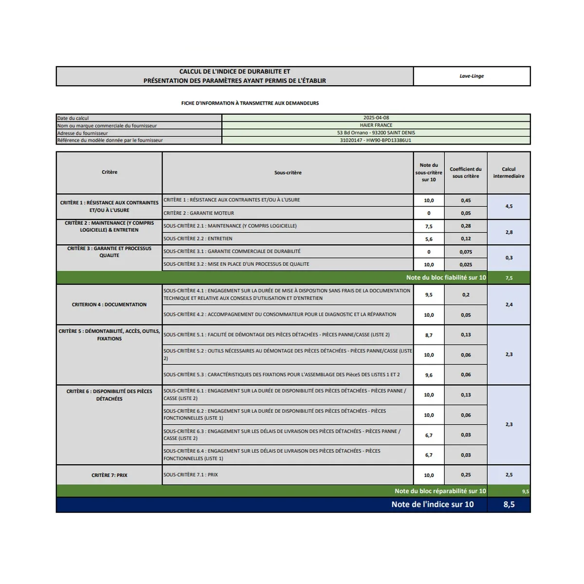 Indice réparabilité (sur 10) |