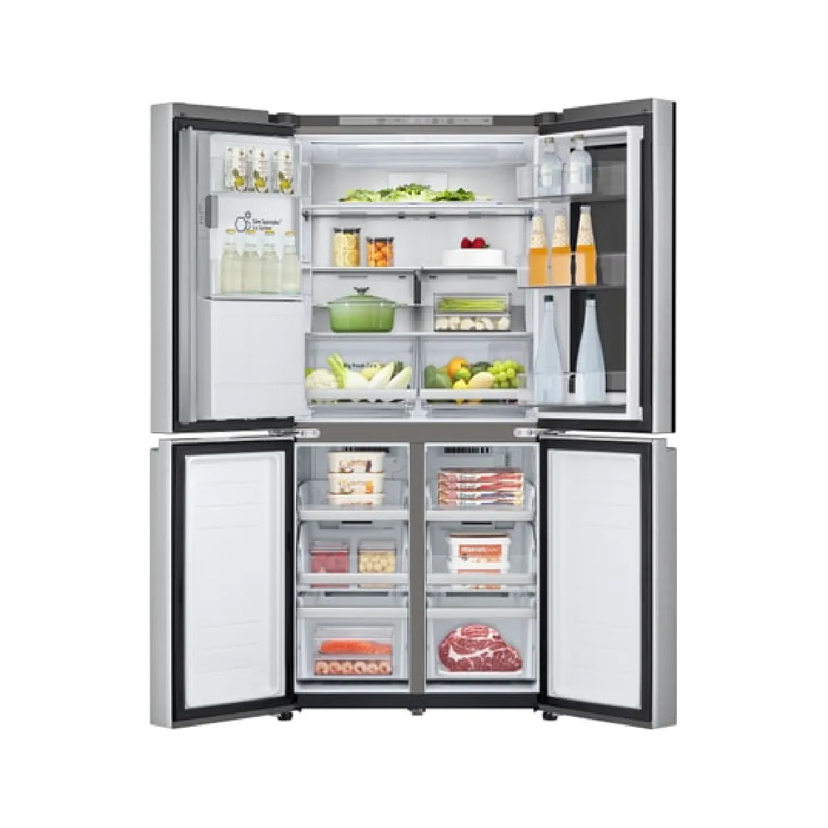 Les 4 portes et la largeur de 83.5 cm facilitent l'accès aux aliments tout en préservant le froid. Le réfrigérateur offre 3 clayettes, 5 balconnets et 2 tiroirs dont une Big Fresh Zone dédiée aux produits frais, idéale pour la viande ou le poisson proches de 0 °C. La technologie No Frost avec froid ventilé limite la formation de givre et assure une répartition uniforme de l'air, ce qui réduit les fluctuations et simplifie l'entretien. Door Cooling+ crée un rideau d'air à l'avant pour refroidir plus vite les denrées rangées dans la porte.