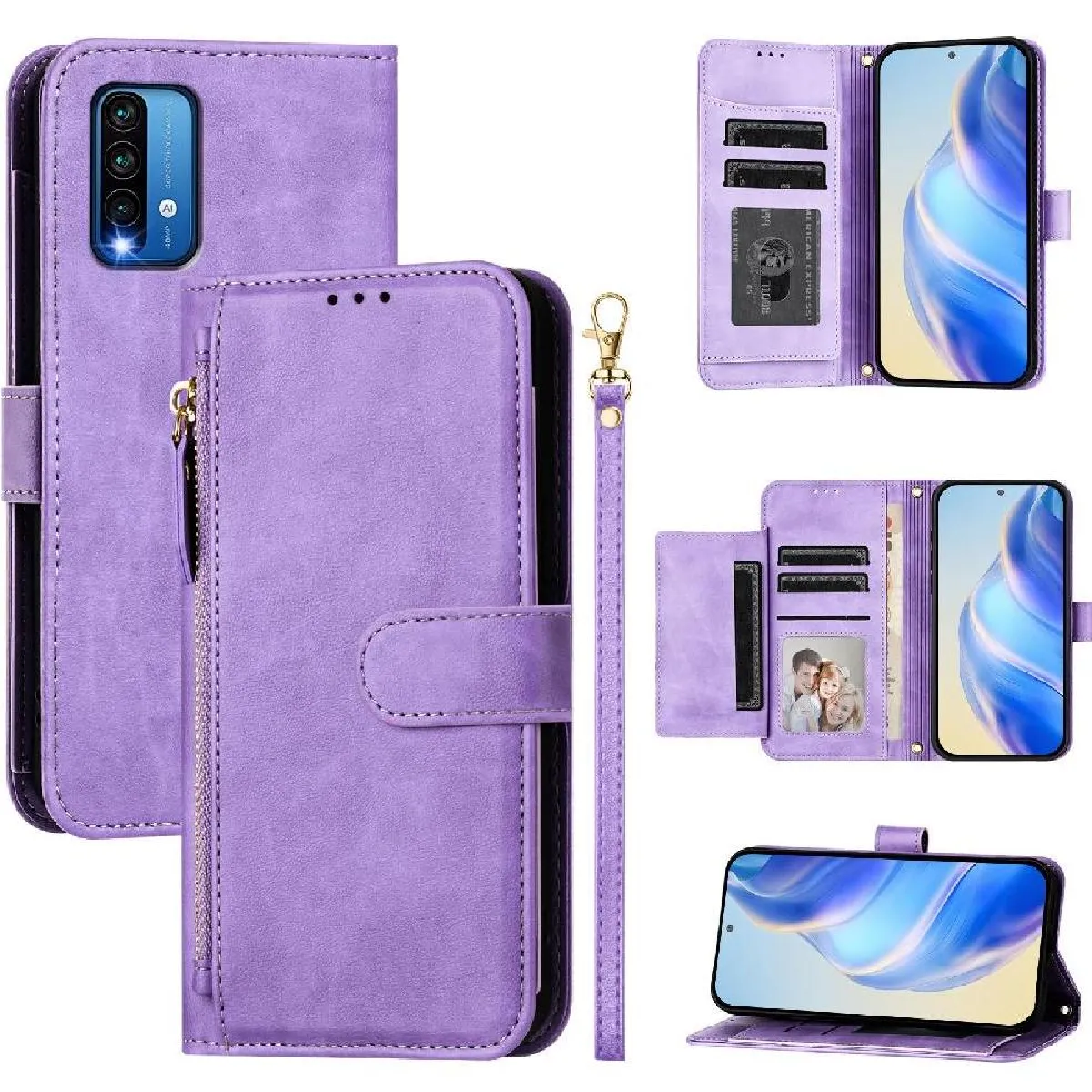 Coque pour Tongez Étui Pour Puissance Xiaomi Redmi 9 Fermeture Éclair Titulaire De La Carte Cuir PU Magnétique FOXDOCK Violet