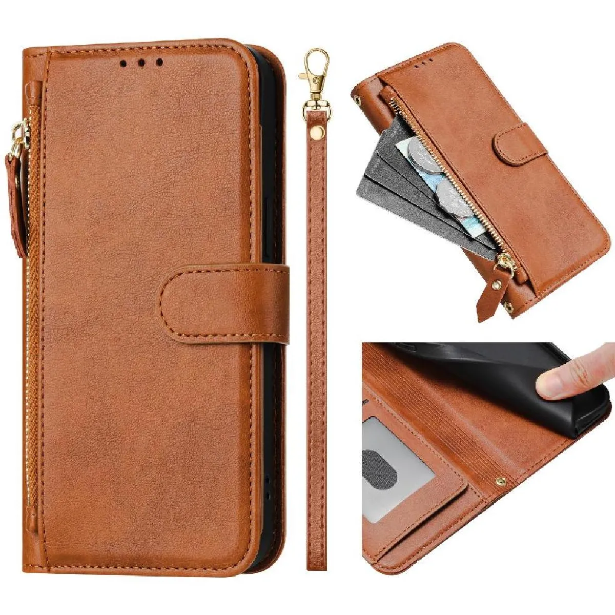 Étui portefeuille en cuir PU avec protection antichocs - Poche zippée - Boutons accès facile
