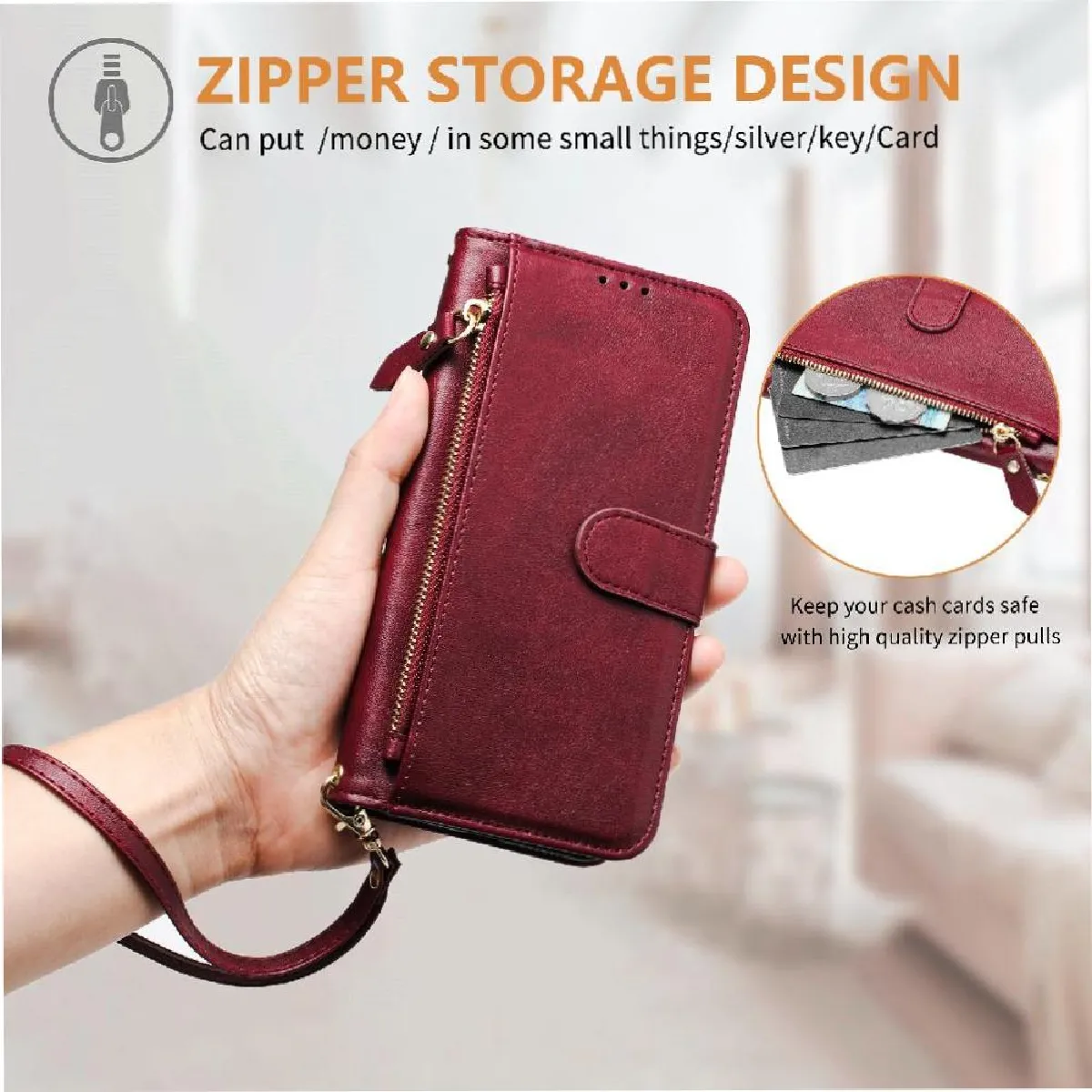 Fonctionnalité du portefeuille 2 en 1: cet étui portefeuille élégant comprend six emplacements pour cartes, un emplacement de caisse visible et une poche à fermeture éclair, ce qui facilite le transport de votre pièce d'identité, de vos cartes de crédit, et de l'argent sans la majeure partie d'un portefeuille traditionnel.