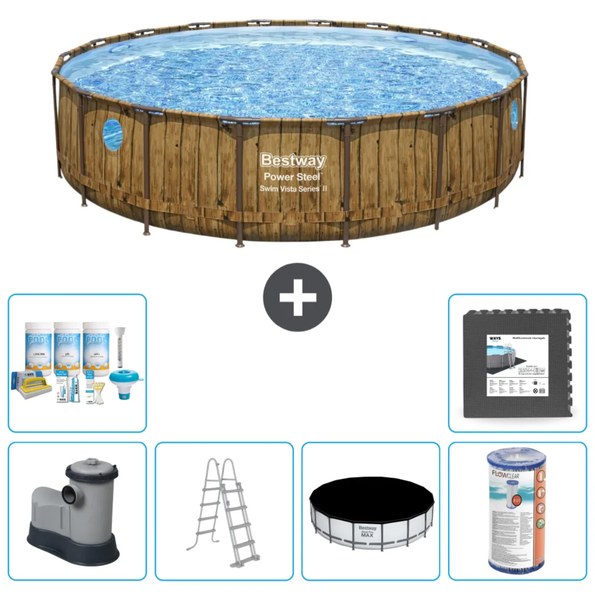 Le forfait entretien piscine WAYS a été spécialement élaboré pour bien entretenir votre piscine. Ce forfait contient tout ce dont vous avez besoin pour garder votre eau en parfait état tout au long de l'été. De plus, vous trouverez toutes les informations nécessaires à l'utilisation des éléments d'entretien dans la « Brochure Piscine WAYS » fournie.Y compris la cartouche filtrante Bestway de type III