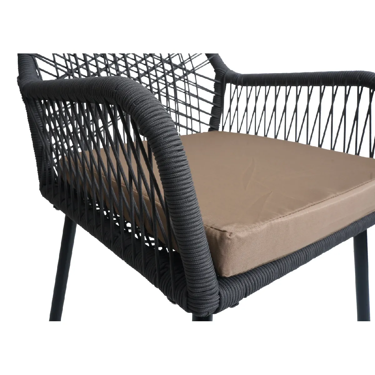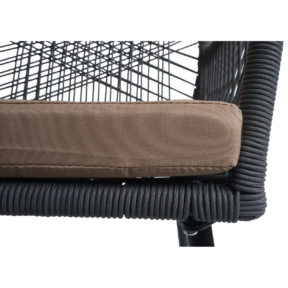 Le tressage décoratif en corde, renforcé par un caoutchouc hydrofuge, assure une flexibilité d'assise agréable et une tenue adaptée aux usages en plein air. Le piètement en aluminium stable et léger facilite le déplacement tout en garantissant une structure robuste. Le coussin en mousse polyuréthane densité 25D procure un soutien mediumsoft, adapté aux moments prolongés autour de la table. Les accoudoirs et la hauteur d'assise de 46 cm favorisent une posture naturelle.